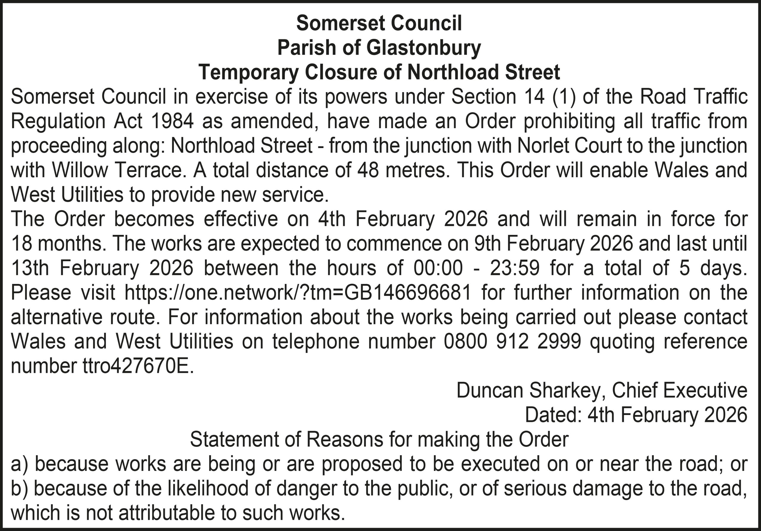 The Order becomes effective on 4th February 2026 and will remain in force for 18 months. The works are expected to commence on 9th February 2026 and last until 13th February 2026 between the hours of 00:00 – 23:59 for a total of 5 days. Please visit https://one.network/?tm=GB146696681 for further information on the alternative route. For information about the works being carried out please contact Wales and West Utilities on telephone number 0800 912 2999 quoting reference number ttro427670E.