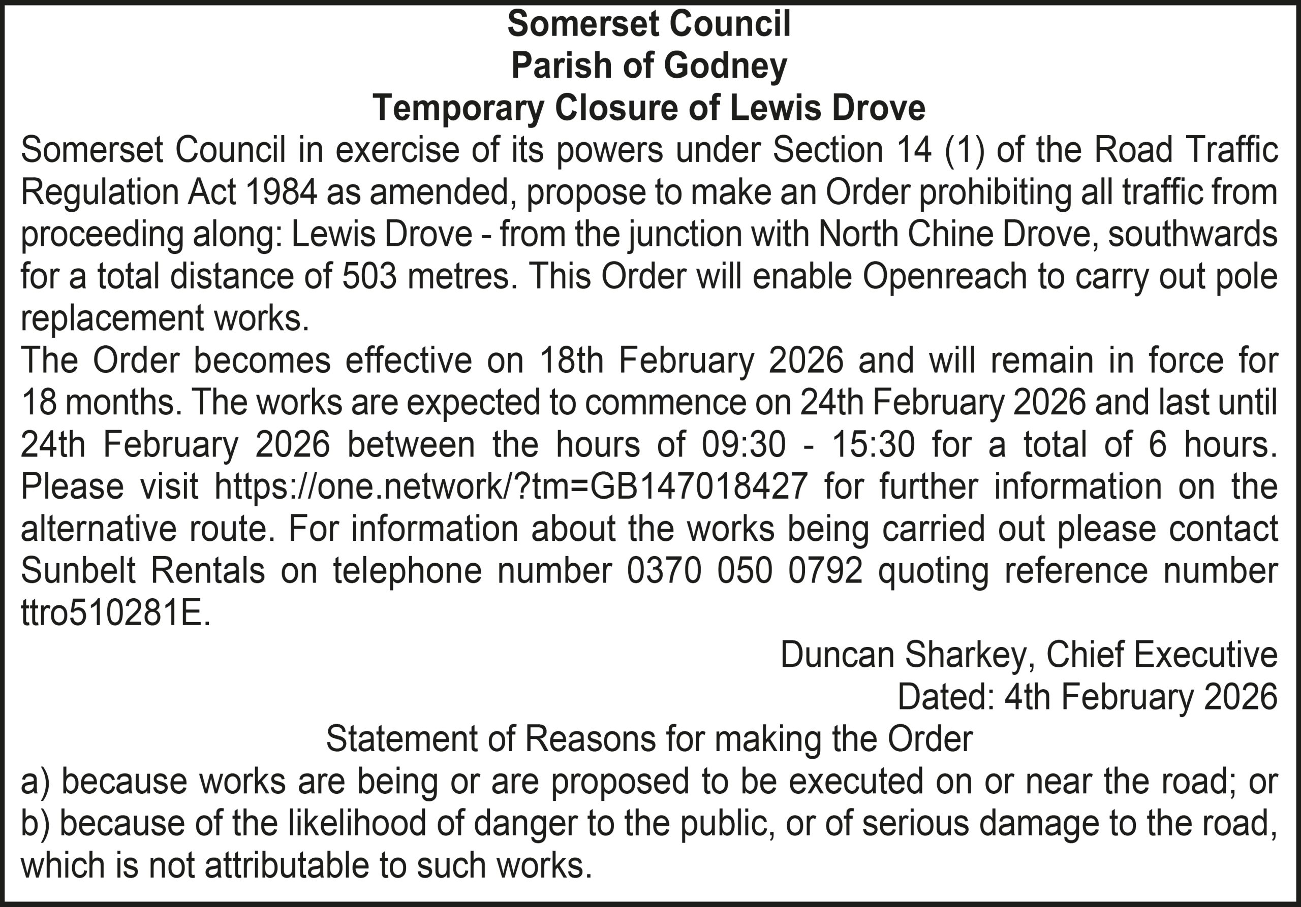 Somerset Council in exercise of its powers under Section 14 (1) of the Road Traffic Regulation Act 1984 as amended, propose to make an Order prohibiting all traffic from proceeding along: Lewis Drove – from the junction with North Chine Drove, southwards for a total distance of 503 metres. This Order will enable Openreach to carry out pole replacement works.