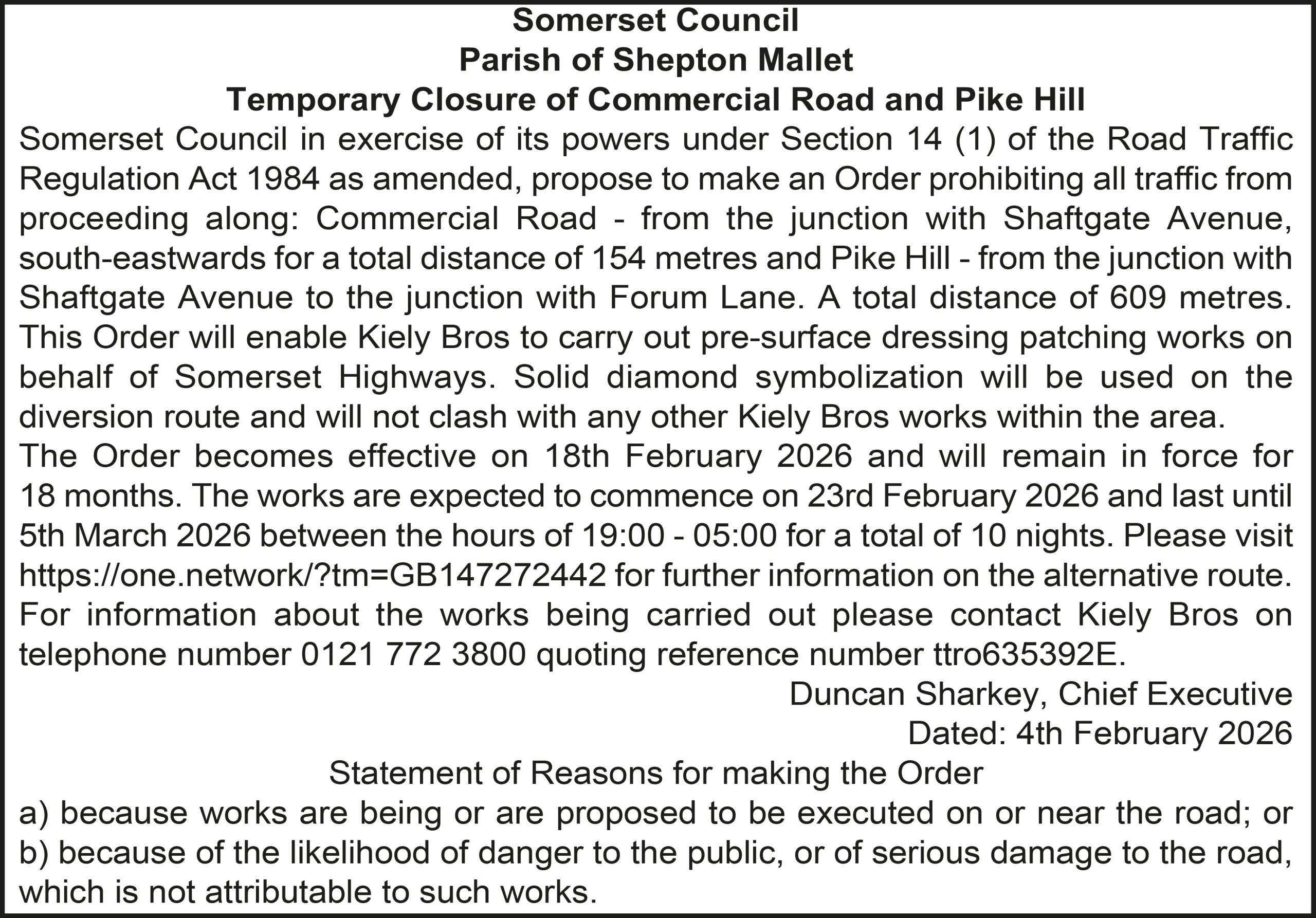 Somerset Council in exercise of its powers under Section 14 (1) of the Road Traffic Regulation Act 1984 as amended, propose to make an Order prohibiting all traffic from proceeding along: Commercial Road – from the junction with Shaftgate Avenue, south-eastwards for a total distance of 154 metres and Pike Hill – from the junction with Shaftgate Avenue to the junction with Forum Lane. A total distance of 609 metres. This Order will enable Kiely Bros to carry out pre-surface dressing patching works on behalf of Somerset Highways. Solid diamond symbolization will be used on the diversion route and will not clash with any other Kiely Bros works within the area.