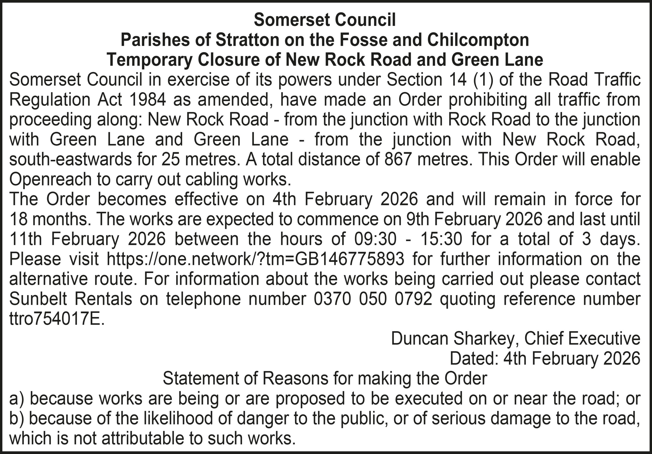 The Order becomes effective on 4th February 2026 and will remain in force for 18 months. The works are expected to commence on 9th February 2026 and last until 11th February 2026 between the hours of 09:30 – 15:30 for a total of 3 days. Please visit https://one.network/?tm=GB146775893 for further information on the alternative route. For information about the works being carried out please contact Sunbelt Rentals on telephone number 0370 050 0792 quoting reference number ttro754017E.
