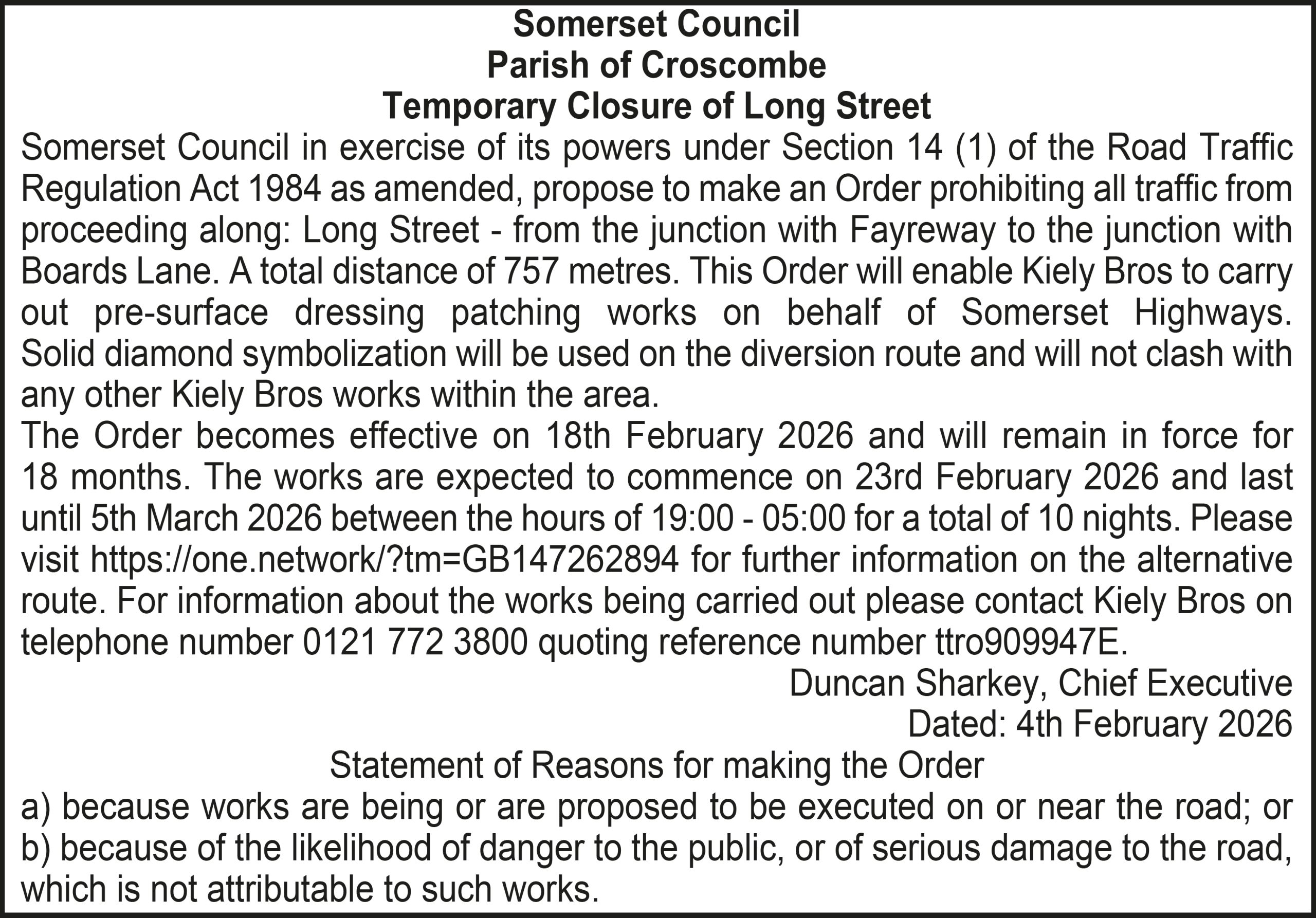 Somerset Council in exercise of its powers under Section 14 (1) of the Road Traffic Regulation Act 1984 as amended, propose to make an Order prohibiting all traffic from proceeding along: Long Street – from the junction with Fayreway to the junction with Boards Lane. A total distance of 757 metres. This Order will enable Kiely Bros to carry out pre-surface dressing patching works on behalf of Somerset Highways. Solid diamond symbolization will be used on the diversion route and will not clash with any other Kiely Bros works within the area.