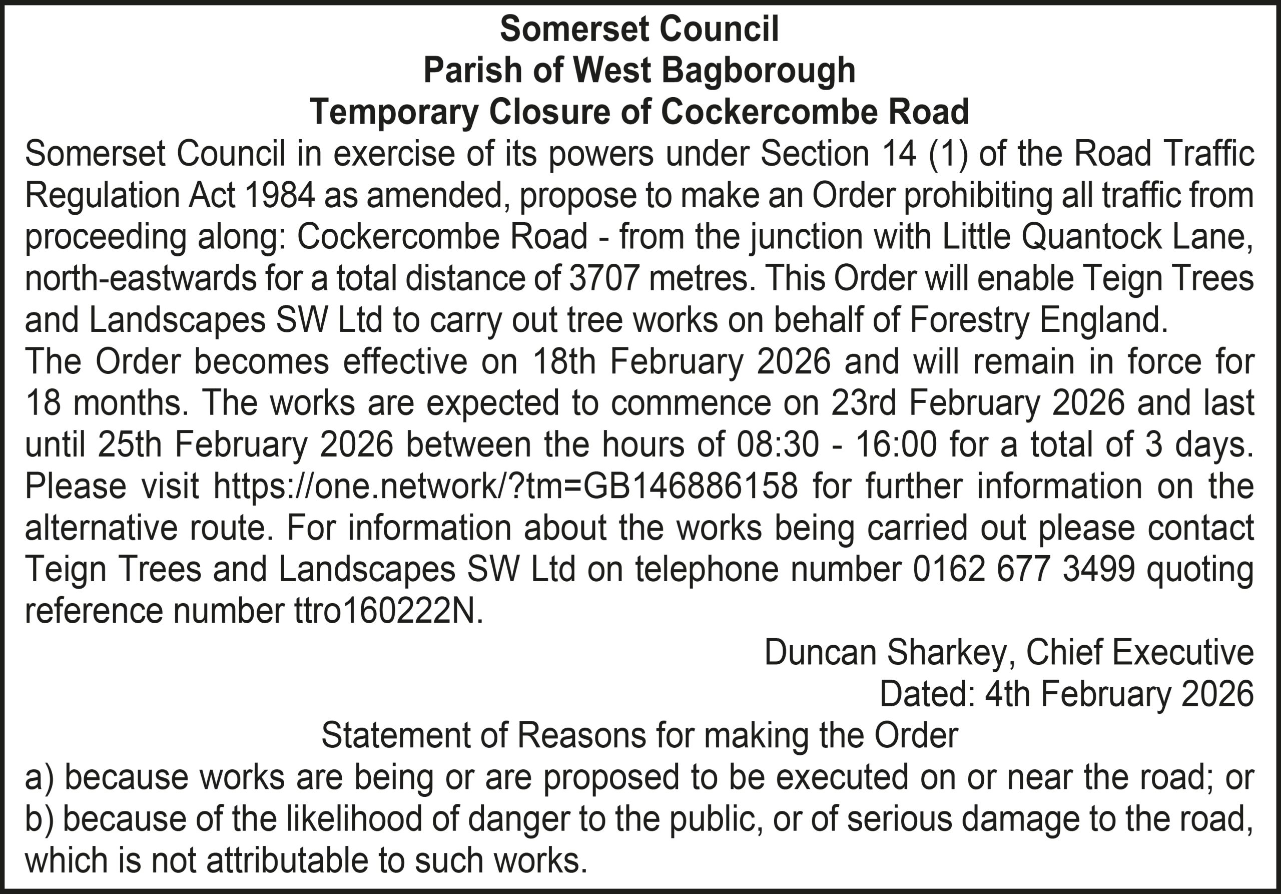 The Order becomes effective on 18th February 2026 and will remain in force for 18 months. The works are expected to commence on 23rd February 2026 and last until 25th February 2026 between the hours of 08:30 – 16:00 for a total of 3 days. Please visit https://one.network/?tm=GB146886158 for further information on the alternative route. For information about the works being carried out please contact Teign Trees and Landscapes SW Ltd on telephone number 0162 677 3499 quoting reference number ttro160222N.