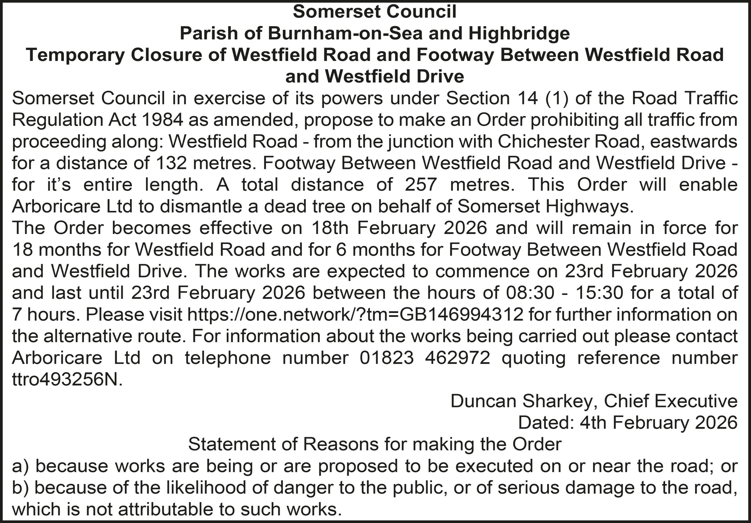 The Order becomes effective on 18th February 2026 and will remain in force for 18 months. The works are expected to commence on 24th February 2026 and last until 26th February 2026 between the hours of 08:00 – 16:00 for a total of 3 days. Please visit https://one.network/?tm=GB147022244 for further information on the alternative routes. For information about the works being carried out please contact Arboricare Ltd on telephone number 01823 462972 quoting reference number ttro707102W(TD).