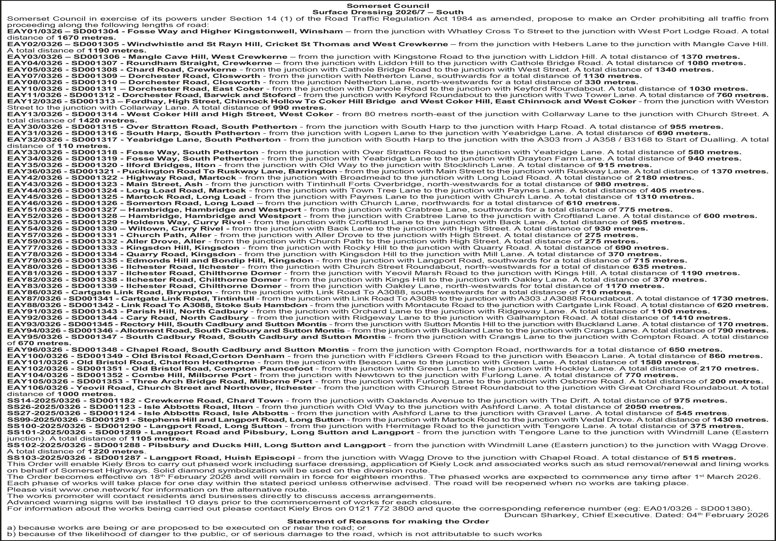 Somerset Council in exercise of its powers under Section 14 (1) of the Road Traffic Regulation Act 1984 as amended, have made an Order prohibiting all traffic from proceeding along: Comer Road – from the junction with Southfield to the junction with Wideatts Road. A total distance of 226 metres. This Order will enable Kiely Bros to carry out pre-surface dressing patching works on behalf of Somerset Highways.