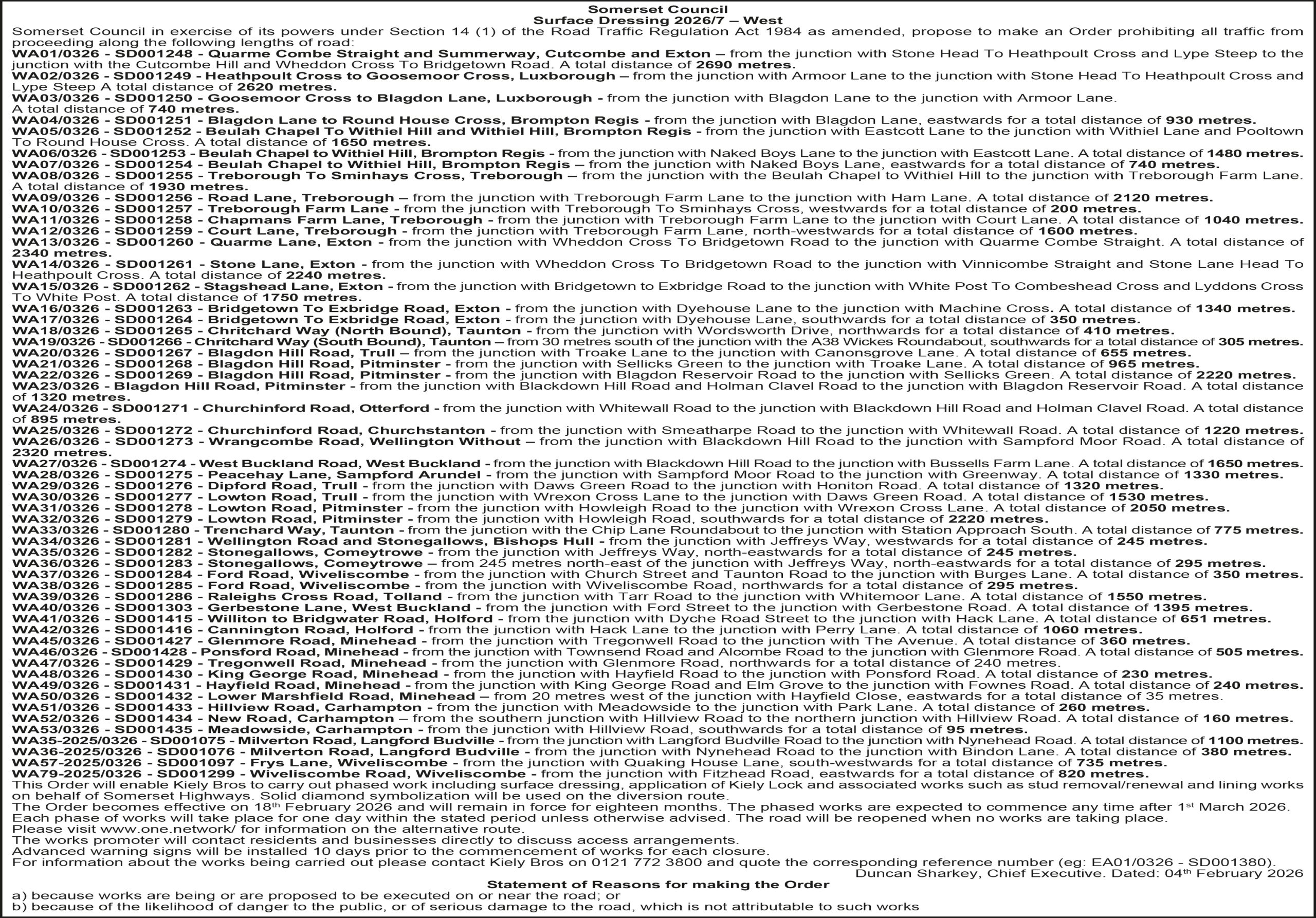 Somerset Council in exercise of its powers under Section 14 (1) of the Road Traffic Regulation Act 1984 as amended, have made an Order prohibiting all traffic from proceeding along: Peacehay Lane – from the junction with Greenway to the junction with Sampford Moor Road. A total distance of 1300 metres. This Order will enable Kiely Bros to carry out pre-surface dressing patching works on behalf of Somerset Highways.