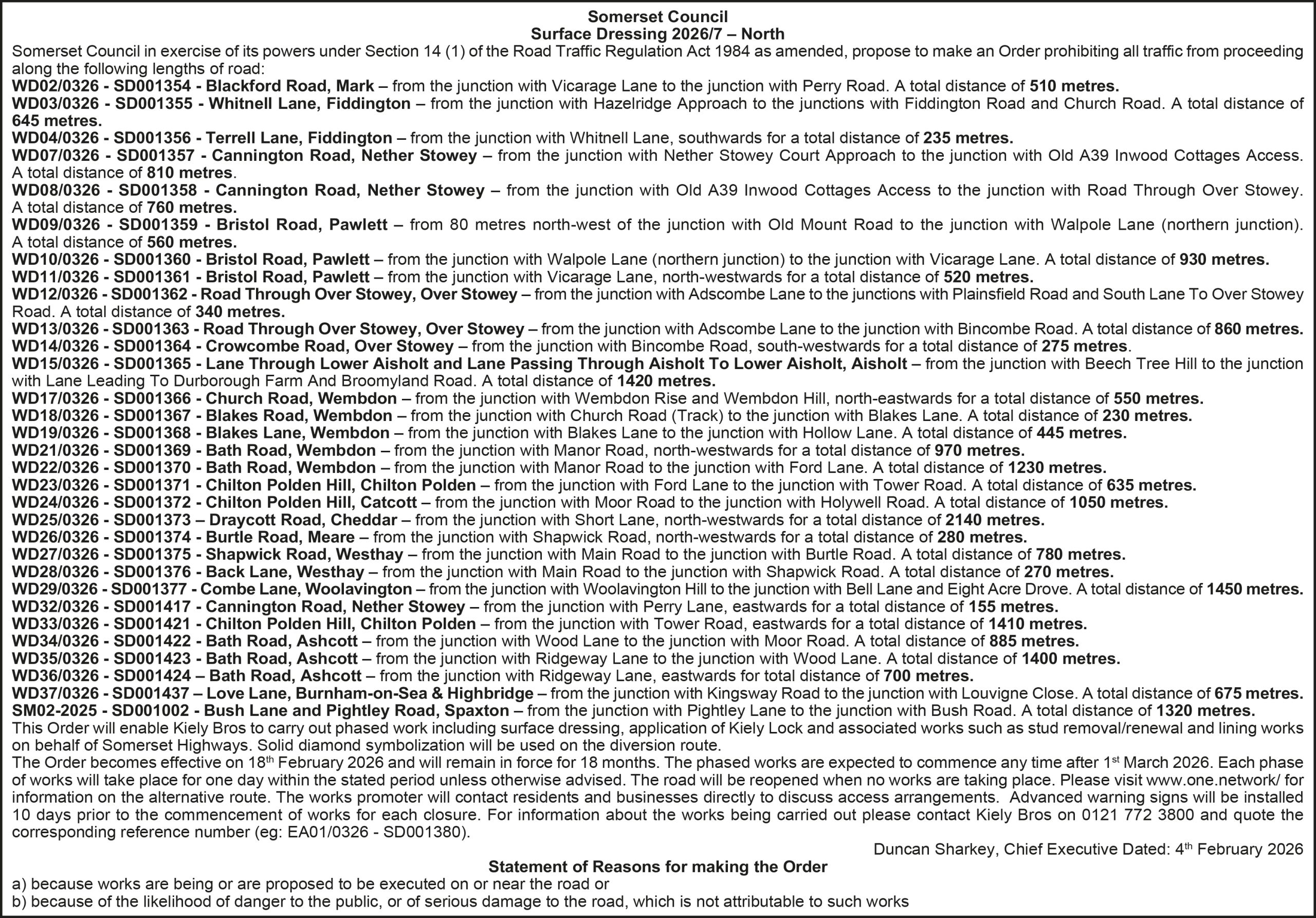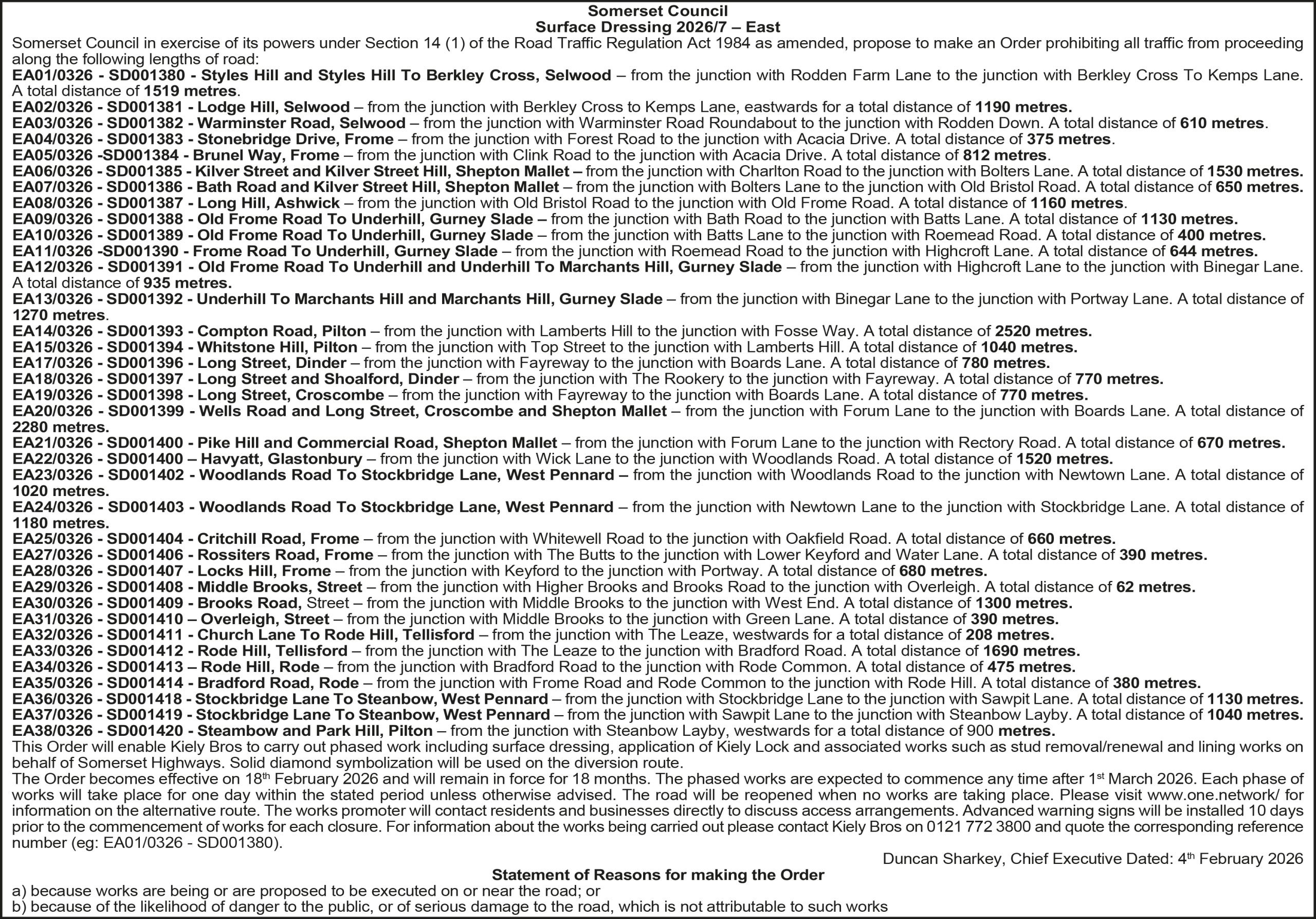 Somerset Council in exercise of its powers under Section 14 (1) of the Road Traffic Regulation Act 1984 as amended, propose to make an Order prohibiting all traffic from proceeding along: Wells Road – from the junction with Forum Lane, westwards for a total distance of 1499 metres. This Order will enable Kiely Bros to carry out pre-surface dressing patching works on behalf of Somerset Highways. Solid diamond symbolization will be used on the diversion route and will not clash with any other Kiely Bros works within the area.