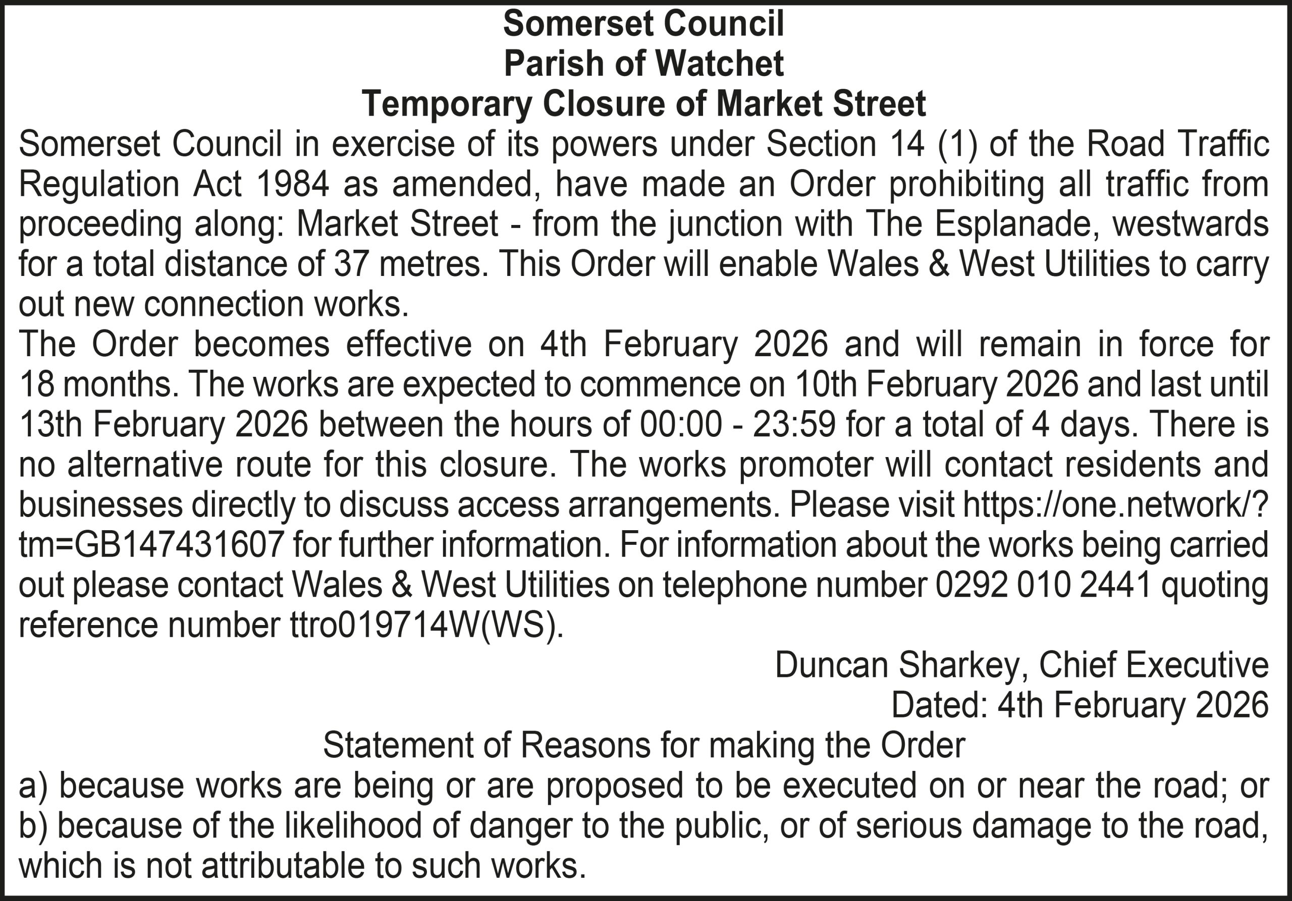 Somerset Council in exercise of its powers under Section 14 (1) of the Road Traffic Regulation Act 1984 as amended, have made an Order prohibiting all traffic from proceeding along: Market Street – from the junction with The Esplanade, westwards for a total distance of 37 metres. This Order will enable Wales & West Utilities to carry out new connection works.