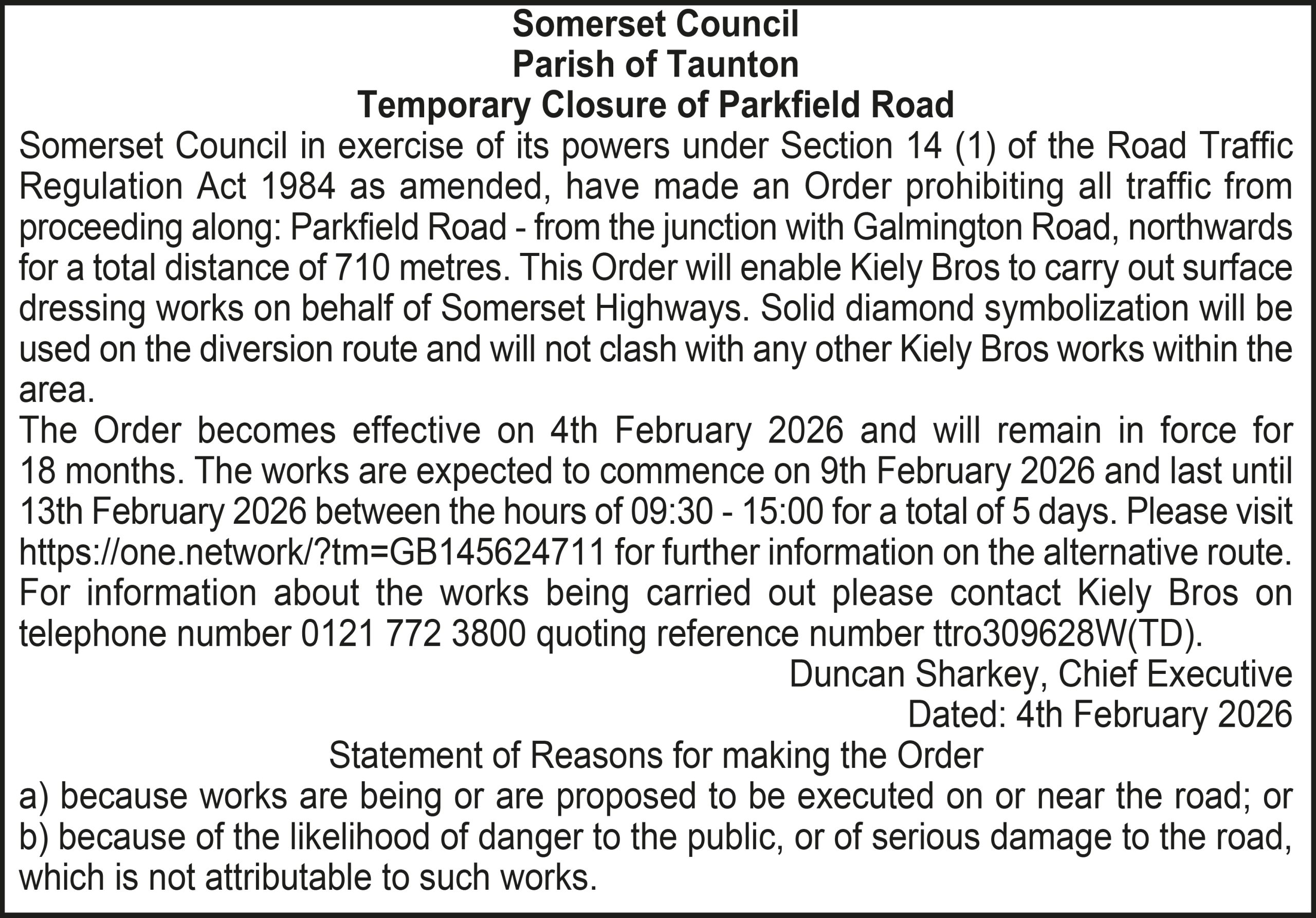 Somerset Council in exercise of its powers under Section 14 (1) of the Road Traffic Regulation Act 1984 as amended, have made an Order prohibiting all traffic from proceeding along: Parkfield Road – from the junction with Galmington Road, northwards for a total distance of 710 metres. This Order will enable Kiely Bros to carry out surface dressing works on behalf of Somerset Highways. Solid diamond symbolization will be used on the diversion route and will not clash with any other Kiely Bros works within the area.