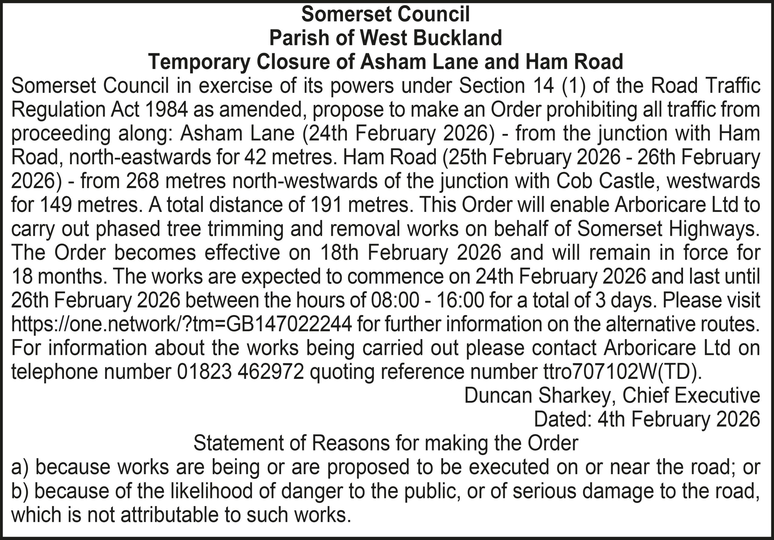 Somerset Council in exercise of its powers under Section 14 (1) of the Road Traffic Regulation Act 1984 as amended, propose to make an Order prohibiting all traffic from proceeding along: Asham Lane (24th February 2026) – from the junction with Ham Road, north-eastwards for 42 metres. Ham Road (25th February 2026 – 26th February 2026) – from 268 metres north-westwards of the junction with Cob Castle, westwards for 149 metres. A total distance of 191 metres. This Order will enable Arboricare Ltd to carry out phased tree trimming and removal works on behalf of Somerset Highways.