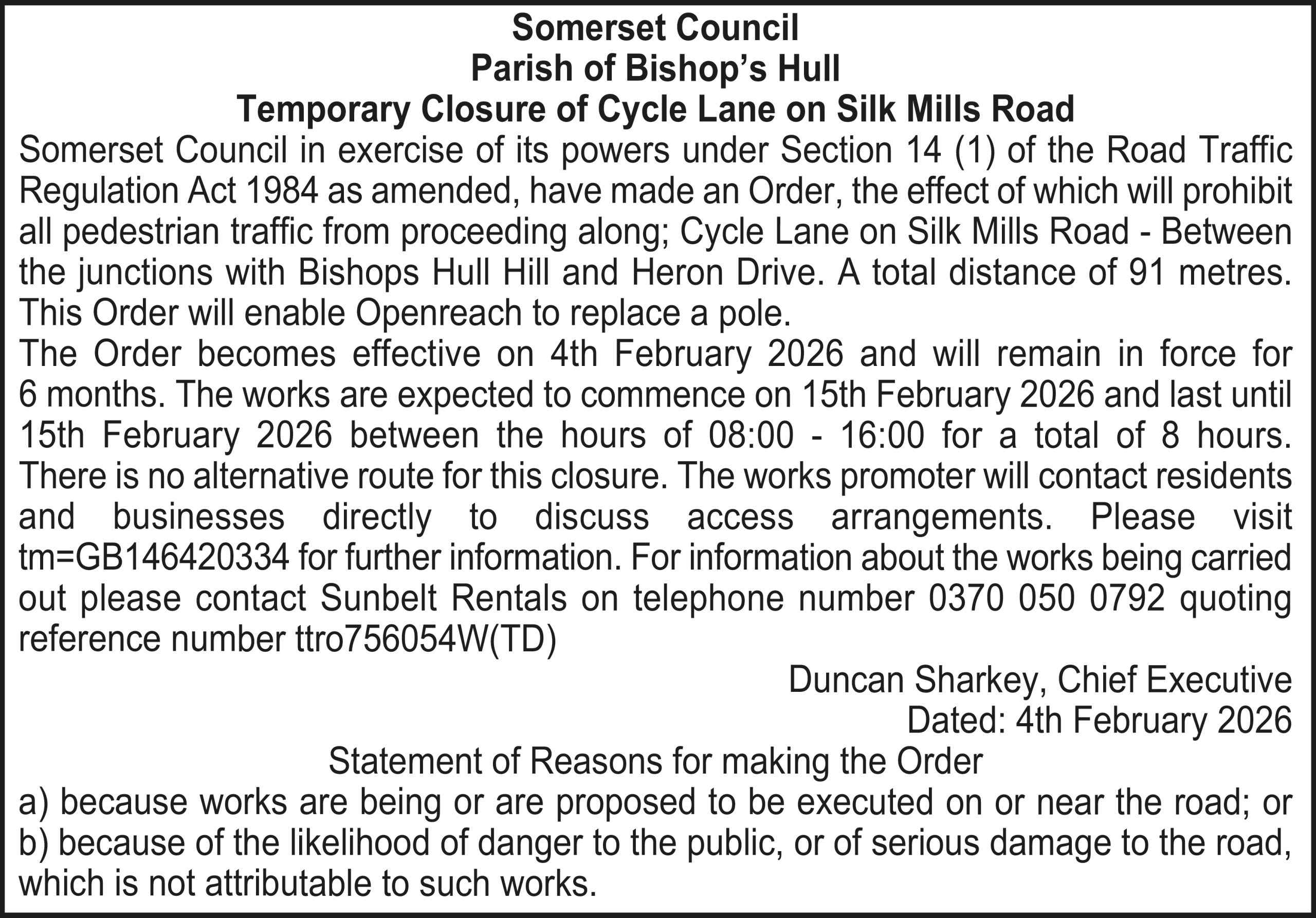 The Order becomes effective on 18th February 2026 and will remain in force for 6 months. The works are expected to commence on 25th February 2026 and last until 26th February 2026 between the hours of 09:30 – 15:30 for a total of 2 days. Please visit https://one.network/?tm=GB147075842 for further information on the alternative route. For information about the works being carried out please contact Sunbelt Rentals on telephone number 0370 050 0792 quoting reference number ttro313448W(WS).