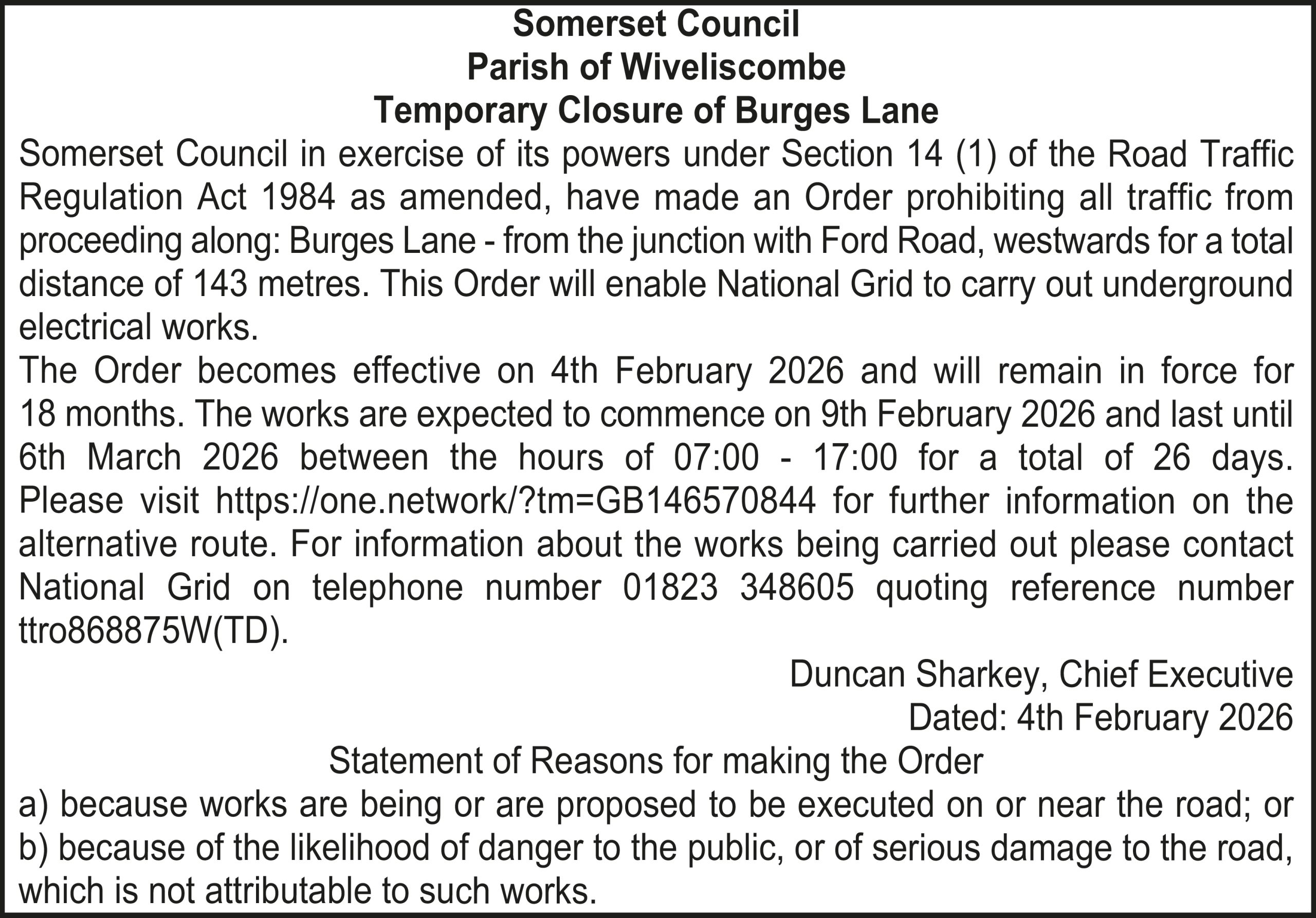 The Order becomes effective on 4th February 2026 and will remain in force for 18 months. The works are expected to commence on 9th February 2026 and last until 6th March 2026 between the hours of 07:00 – 17:00 for a total of 26 days. Please visit https://one.network/?tm=GB146570844 for further information on the alternative route. For information about the works being carried out please contact National Grid on telephone number 01823 348605 quoting reference number ttro868875W(TD).