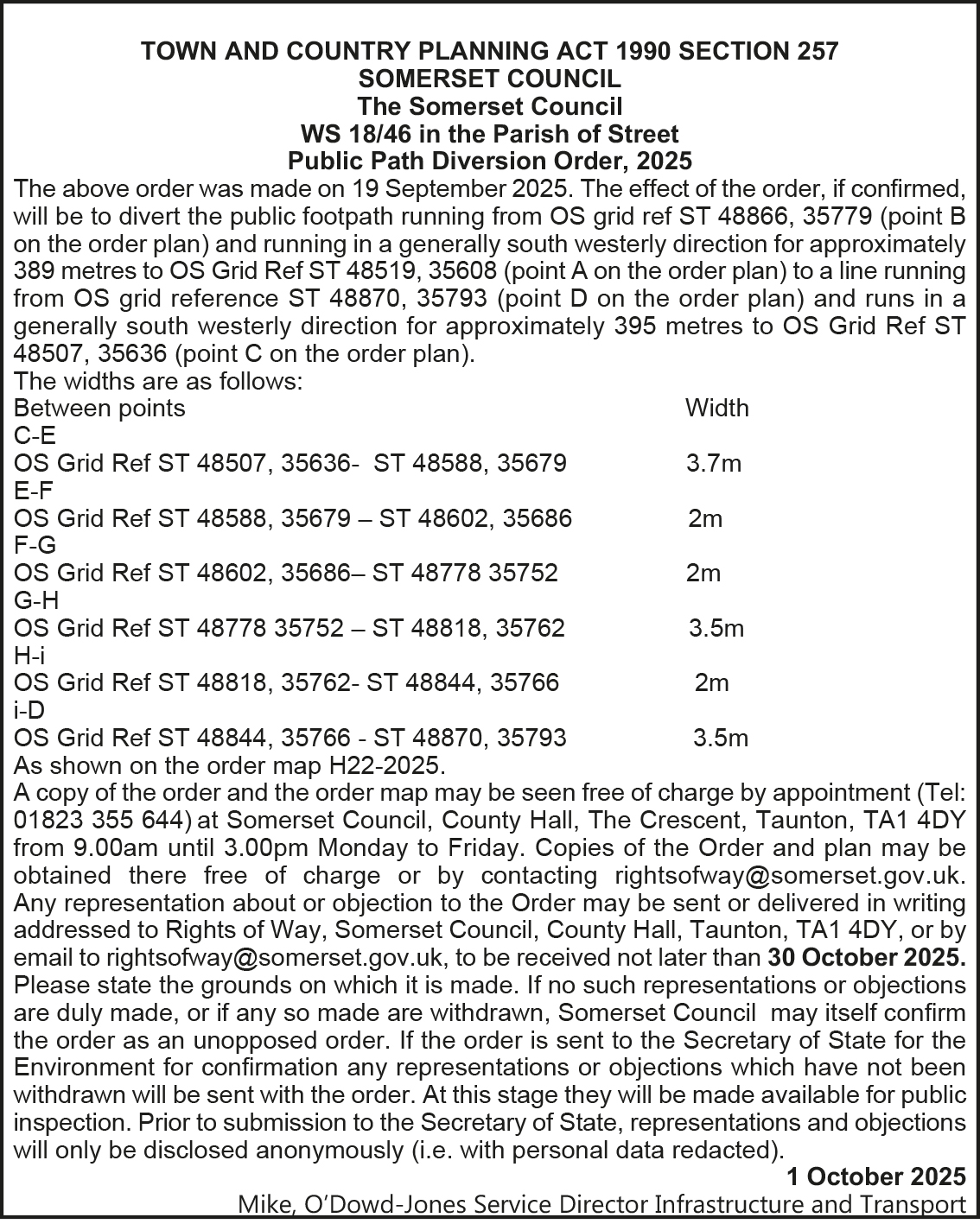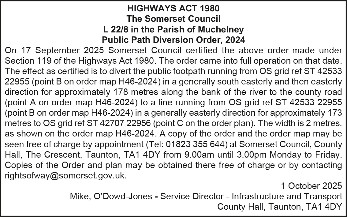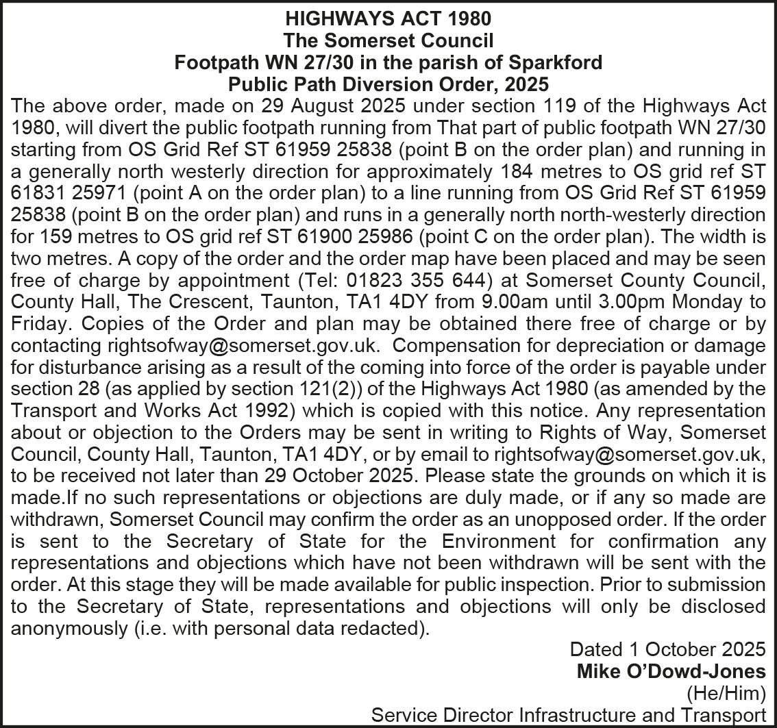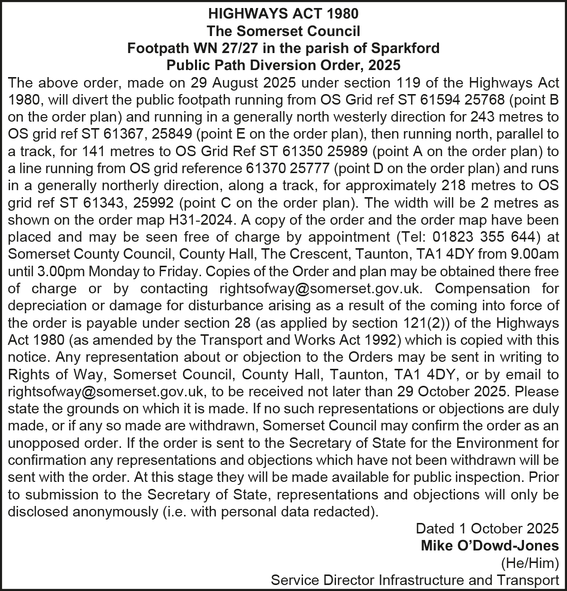 The above order, made on 29 August 2025 under section 119 of the Highways Act 1980, will divert the public footpath running from OS Grid ref ST 61594 25768 (point B on the order plan) and running in a generally north westerly direction for 243 metres to OS grid ref ST 61367, 25849 (point E on the order plan), then running north, parallel to a track, for 141 metres to OS Grid Ref ST 61350 25989 (point A on the order plan) to a line running from OS grid reference 61370 25777 (point D on the order plan) and runs in a generally northerly direction, along a track, for approximately 218 metres to OS grid ref ST 61343, 25992 (point C on the order plan). The width will be 2 metres as shown on the order map H31-2024. A copy of the order and the order map have been placed and may be seen free of charge by appointment (Tel: 01823 355 644) at Somerset County Council, County Hall, The Crescent, Taunton, TA1 4DY from 9.00am until 3.00pm Monday to Friday. Copies of the Order and plan may be obtained there free of charge or by contacting rightsofway@somerset.gov.uk. Compensation for depreciation or damage for disturbance arising as a result of the coming into force of the order is payable under section 28 (as applied by section 121(2)) of the Highways Act 1980 (as amended by the Transport and Works Act 1992) which is copied with this notice. Any representation about or objection to the Orders may be sent in writing to Rights of Way, Somerset Council, County Hall, Taunton, TA1 4DY, or by email to rightsofway@somerset.gov.uk, to be received not later than 29 October 2025. Please state the grounds on which it is made. If no such representations or objections are duly made, or if any so made are withdrawn, Somerset Council may confirm the order as an unopposed order. If the order is sent to the Secretary of State for the Environment for confirmation any representations and objections which have not been withdrawn will be sent with the order. At this stage they will be made available for public inspection. Prior to submission to the Secretary of State, representations and objections will only be disclosed anonymously (i.e. with personal data redacted).