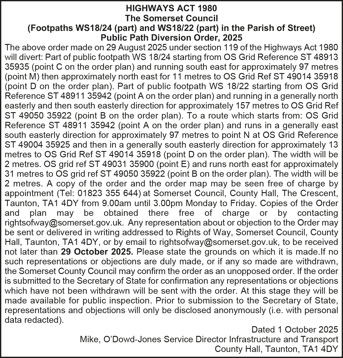 The above order made on 29 August 2025 under section 119 of the Highways Act 1980 will divert: Part of public footpath WS 18/24 starting from OS Grid Reference ST 48913 35935 (point C on the order plan) and running south east for approximately 97 metres (point M) then approximately north east for 11 metres to OS Grid Ref ST 49014 35918 (point D on the order plan). Part of public footpath WS 18/22 starting from OS Grid Reference ST 48911 35942 (point A on the order plan) and running in a generally north easterly and then south easterly direction for approximately 157 metres to OS Grid Ref ST 49050 35922 (point B on the order plan). To a route which starts from: OS Grid Reference ST 48911 35942 (point A on the order plan) and runs in a generally east south easterly direction for approximately 97 metres to point N at OS Grid Reference ST 49004 35925 and then in a generally south easterly direction for approximately 13 metres to OS Grid Ref ST 49014 35918 (point D on the order plan). The width will be 2 metres. OS grid ref ST 49031 35900 (point E) and runs north east for approximately 31 metres to OS grid ref ST 49050 35922 (point B on the order plan). The width will be 2 metres. A copy of the order and the order map may be seen free of charge by appointment (Tel: 01823 355 644) at Somerset Council, County Hall, The Crescent, Taunton, TA1 4DY from 9.00am until 3.00pm Monday to Friday. Copies of the Order and plan may be obtained there free of charge or by contacting rightsofway@somerset.gov.uk. Any representation about or objection to the Order may be sent or delivered in writing addressed to Rights of Way, Somerset Council, County Hall, Taunton, TA1 4DY, or by email to rightsofway@somerset.gov.uk, to be received not later than 29 October 2025. Please state the grounds on which it is made. If no such representations or objections are duly made, or if any so made are withdrawn, the Somerset County Council may confirm the order as an unopposed order. If the order is submitted to the Secretary of State for confirmation any representations or objections which have not been withdrawn will be sent with the order. At this stage they will be made available for public inspection. Prior to submission to the Secretary of State, representations and objections will only be disclosed anonymously (i.e. with personal data redacted).
