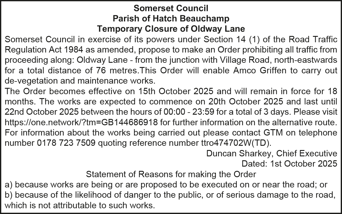 Somerset Council in exercise of its powers under Section 14 (1) of the Road Traffic Regulation Act 1984 as amended, propose to make an Order prohibiting all traffic from proceeding along: Oldway Lane – from the junction with Village Road, north-eastwards for a total distance of 76 metres.This Order will enable Amco Griffen to carry out de-vegetation and maintenance works. The Order becomes effective on 15th October 2025 and will remain in force for 18 months. The works are expected to commence on 20th October 2025 and last until 22nd October 2025 between the hours of 00:00 – 23:59 for a total of 3 days. Please visit https://one.network/?tm=GB144686918 for further information on the alternative route. For information about the works being carried out please contact GTM on telephone number 0178 723 7509 quoting reference number ttro474702W(TD).