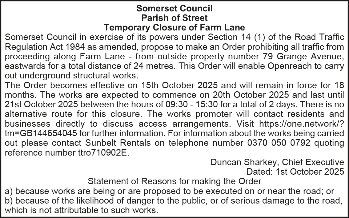 Somerset Council in exercise of its powers under Section 14 (1) of the Road Traffic Regulation Act 1984 as amended, propose to make an Order prohibiting all traffic from proceeding along Farm Lane – from outside property number 79 Grange Avenue, eastwards for a total distance of 24 metres. This Order will enable Openreach to carry out underground structural works. The Order becomes effective on 15th October 2025 and will remain in force for 18 months. The works are expected to commence on 20th October 2025 and last until 21st October 2025 between the hours of 09:30 – 15:30 for a total of 2 days. There is no alternative route for this closure. The works promoter will contact residents and businesses directly to discuss access arrangements. Visit https://one.network/?tm=GB144654045 for further information. For information about the works being carried out please contact Sunbelt Rentals on telephone number 0370 050 0792 quoting reference number ttro710902E.