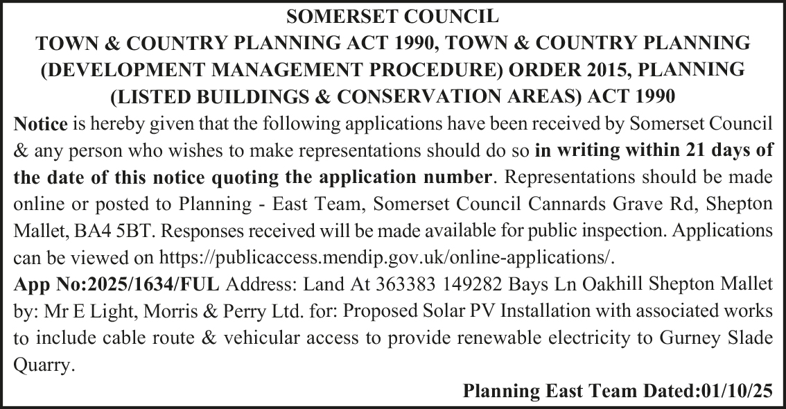SOMERSET LEVELLER: Public notices published in edition 183, October 1, 2025: