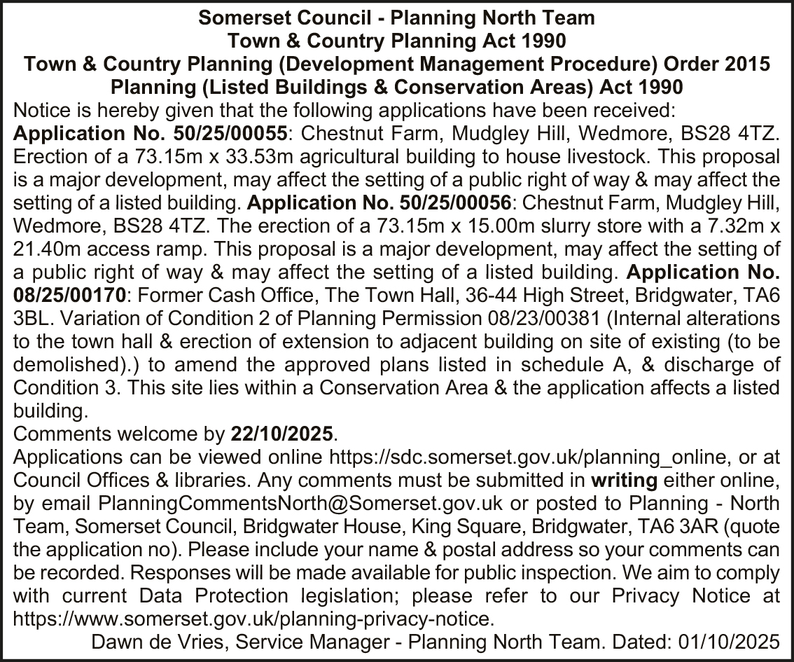 Notice is hereby given that the following applications have been received: Application No. 50/25/00055: Chestnut Farm, Mudgley Hill, Wedmore, BS28 4TZ. Erection of a 73.15m x 33.53m agricultural building to house livestock. This proposal is a major development, may affect the setting of a public right of way & may affect the setting of a listed building. Application No. 50/25/00056: Chestnut Farm, Mudgley Hill, Wedmore, BS28 4TZ. The erection of a 73.15m x 15.00m slurry store with a 7.32m x 21.40m access ramp. This proposal is a major development, may affect the setting of a public right of way & may affect the setting of a listed building. Application No. 08/25/00170: Former Cash Office, The Town Hall, 36-44 High Street, Bridgwater, TA6 3BL. Variation of Condition 2 of Planning Permission 08/23/00381 (Internal alterations to the town hall & erection of extension to adjacent building on site of existing (to be demolished).) to amend the approved plans listed in schedule A, & discharge of Condition 3. This site lies within a Conservation Area & the application affects a listed building.