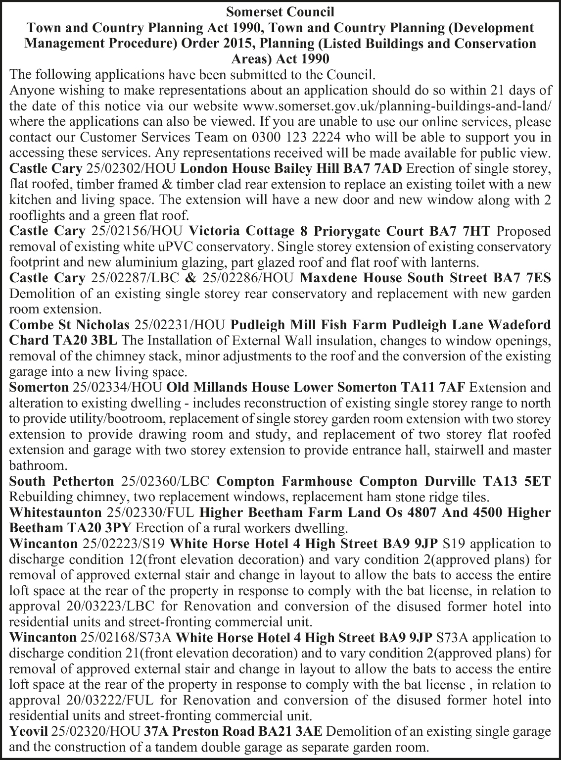 Anyone wishing to make representations about an application should do so within 21 days of the date of this notice via our website www.somerset.gov.uk/planning-buildings-and-land/ where the applications can also be viewed. If you are unable to use our online services, please contact our Customer Services Team on 0300 123 2224 who will be able to support you in accessing these services. Any representations received will be made available for public view.