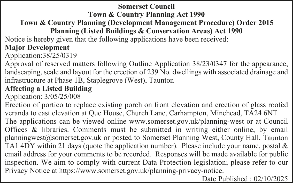 The applications can be viewed online www.somerset.gov.uk/planning-west or at Council Offices & libraries. Comments must be submitted in writing either online, by email planningwest@somerset.gov.uk or posted to Somerset Planning West, County Hall, Taunton TA1 4DY within 21 days (quote the application number). Please include your name, postal & email address for your comments to be recorded. Responses will be made available for public inspection. We aim to comply with current Data Protection legislation; please refer to our Privacy Notice at https://www.somerset.gov.uk/planning-privacy-notice.