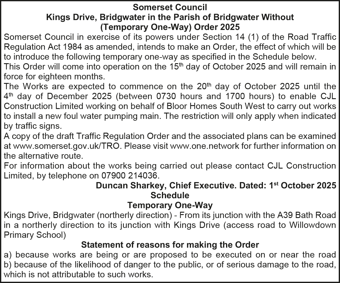 NOTICE is hereby given that on the 26th day of September 2025 Somerset Council made an Experimental Order in exercise of its powers under Sections 1, 2, 4, 9 and 10, and Part IV of Schedule 9 to the Road Traffic Regulation Act 1984, as amended, and of all other enabling powers and after consultation with the Chief Officer of Police in accordance with Part III of Schedule 9 to the Act.