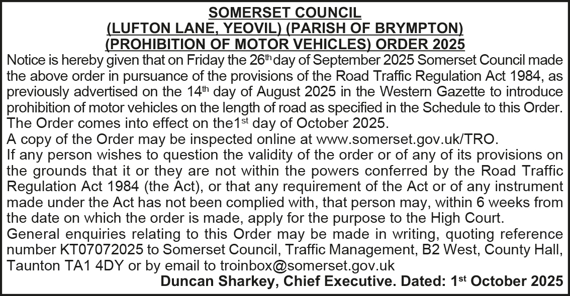 Notice is hereby given that on Friday the 26th day of September 2025 Somerset Council made the above order in pursuance of the provisions of the Road Traffic Regulation Act 1984, as previously advertised on the 14th day of August 2025 in the Western Gazette to introduce prohibition of motor vehicles on the length of road as specified in the Schedule to this Order.