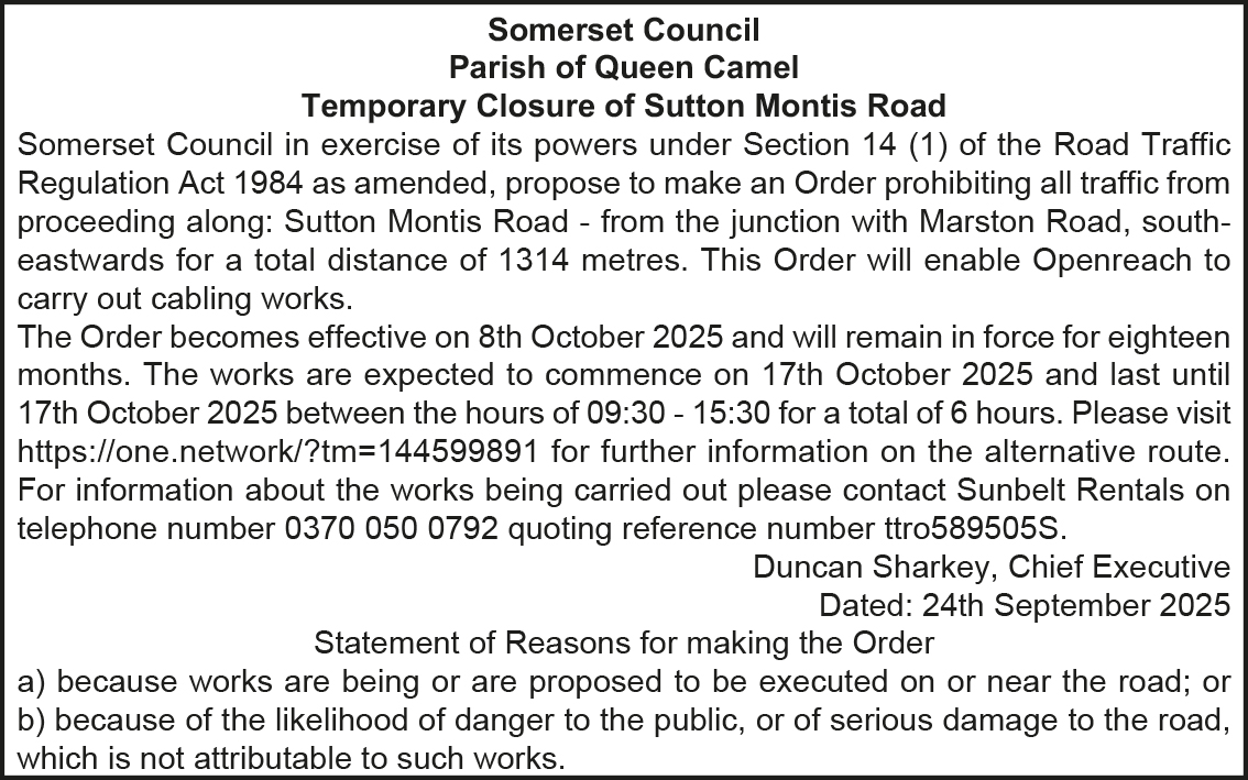 Somerset Council in exercise of its powers under Section 14 (1) of the Road Traffic Regulation Act 1984 as amended, propose to make an Order prohibiting all traffic from proceeding along: Sutton Montis Road – from the junction with Marston Road, southeastwards for a total distance of 1314 metres. This Order will enable Openreach to carry out cabling works.