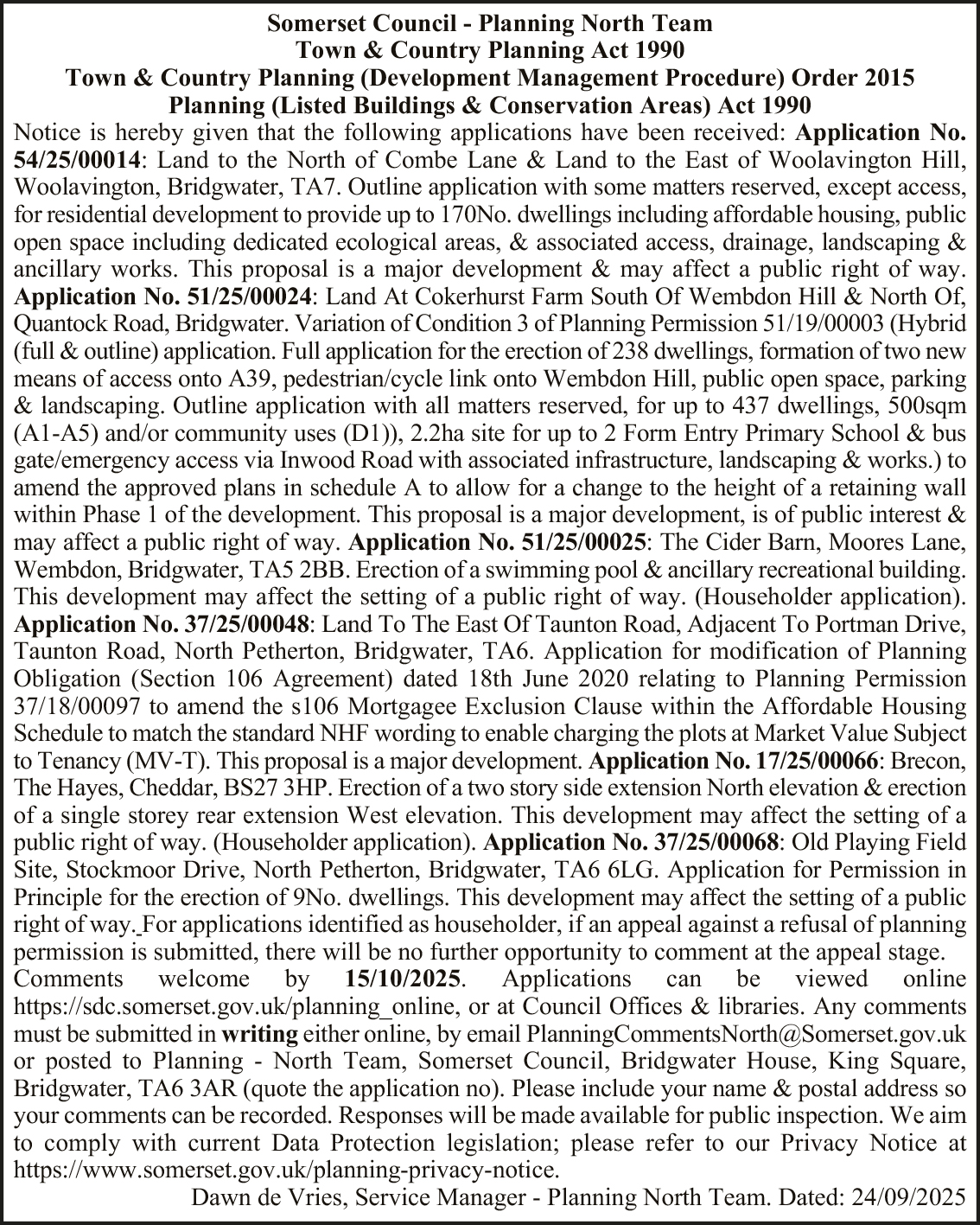 Dawn de Vries, Service Manager – Planning North Team. Dated: 24/09/2025