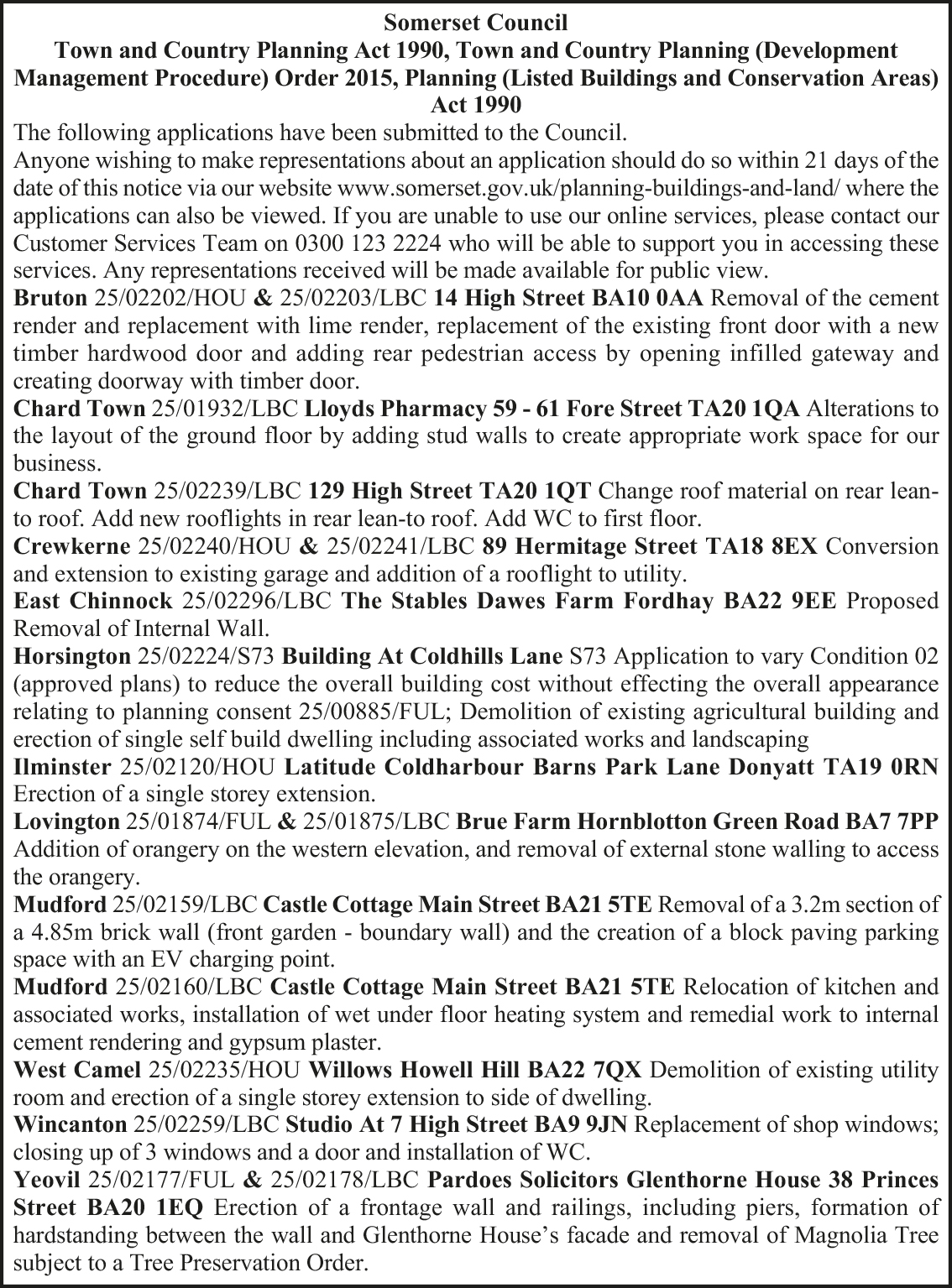 Anyone wishing to make representations about an application should do so within 21 days of the date of this notice via our website www.somerset.gov.uk/planning-buildings-and-land/ where the applications can also be viewed. If you are unable to use our online services, please contact our Customer Services Team on 0300 123 2224 who will be able to support you in accessing these services. Any representations received will be made available for public view.