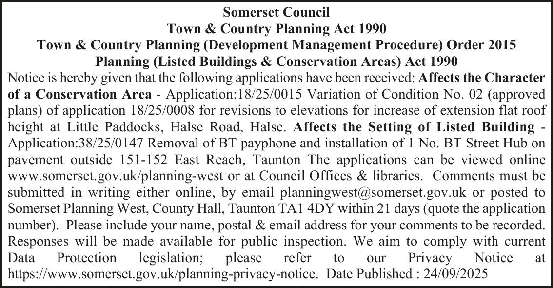 Notice is hereby given that the following applications have been received: Affects the Character of a Conservation Area – Application:18/25/0015 Variation of Condition No. 02 (approved plans) of application 18/25/0008 for revisions to elevations for increase of extension flat roof height at Little Paddocks, Halse Road, Halse. Affects the Setting of Listed Building – Application:38/25/0147 Removal of BT payphone and installation of 1 No. BT Street Hub on pavement outside 151-152 East Reach, Taunton.