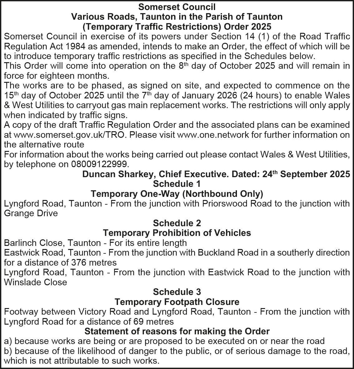 SOMERSET LEVELLER: Public notices published in edition 182, September 24, 2025: