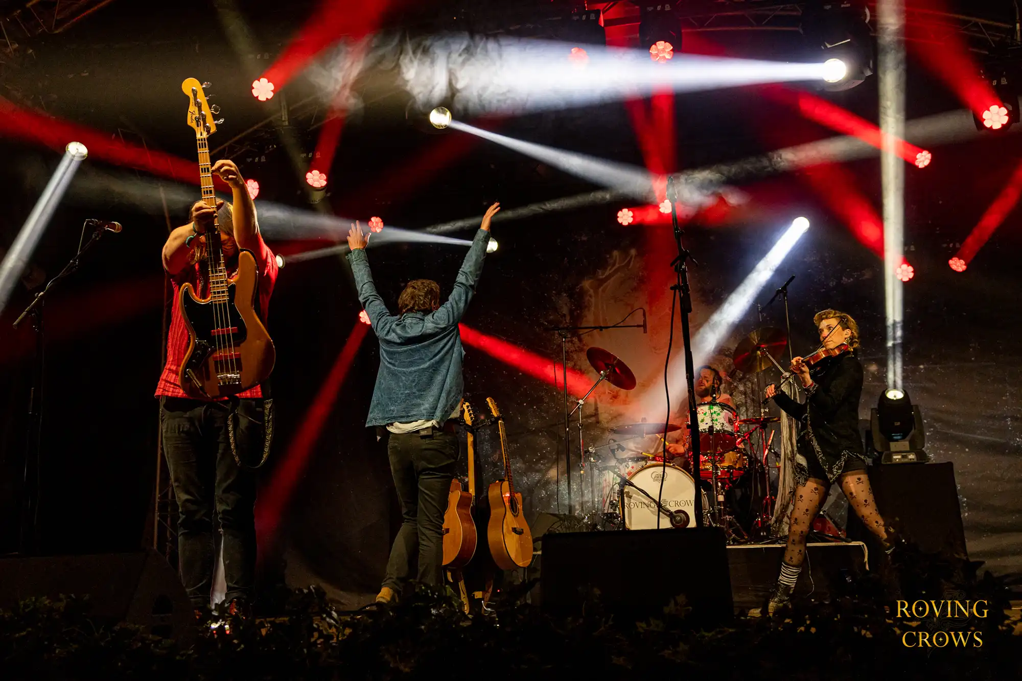 The Roving Crows have become well known for passionate and vibrant live performances, mixing fiery, Celtic-inspired fiddle, conscious, intelligent lyrics, thumping rhythms and driving, innovative bass.