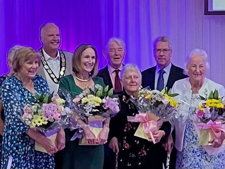 Lady Dodd, Sarah-Jane Bungay, Jenny Boulton and Gill Barnes receiving flowers to thanks them for their support to the theatre. With them, the Mayor of Frome, councillor Andy Jones, Humphrey Barnes and Richard Lines. Picture: Richard Lines