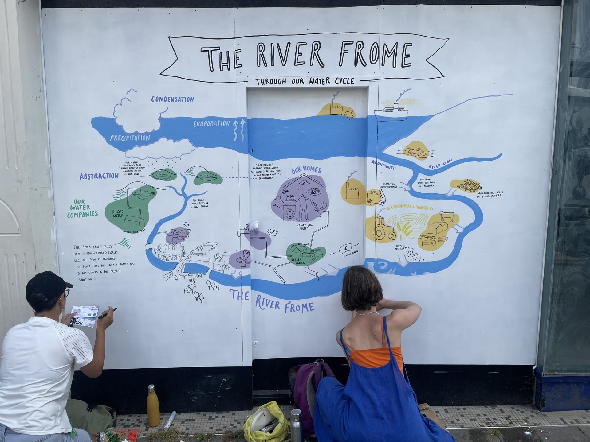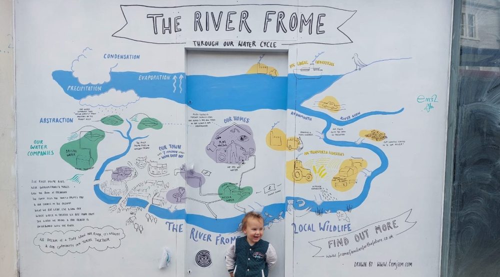 The colourful and educational mural explores the relationship with the local water cycle and the River Frome and is the latest element of Frome Families for the Future’s river vision project – a collaboration with Frome Future Shed via Green and Healthy Frome and supported by Frome Town Council.