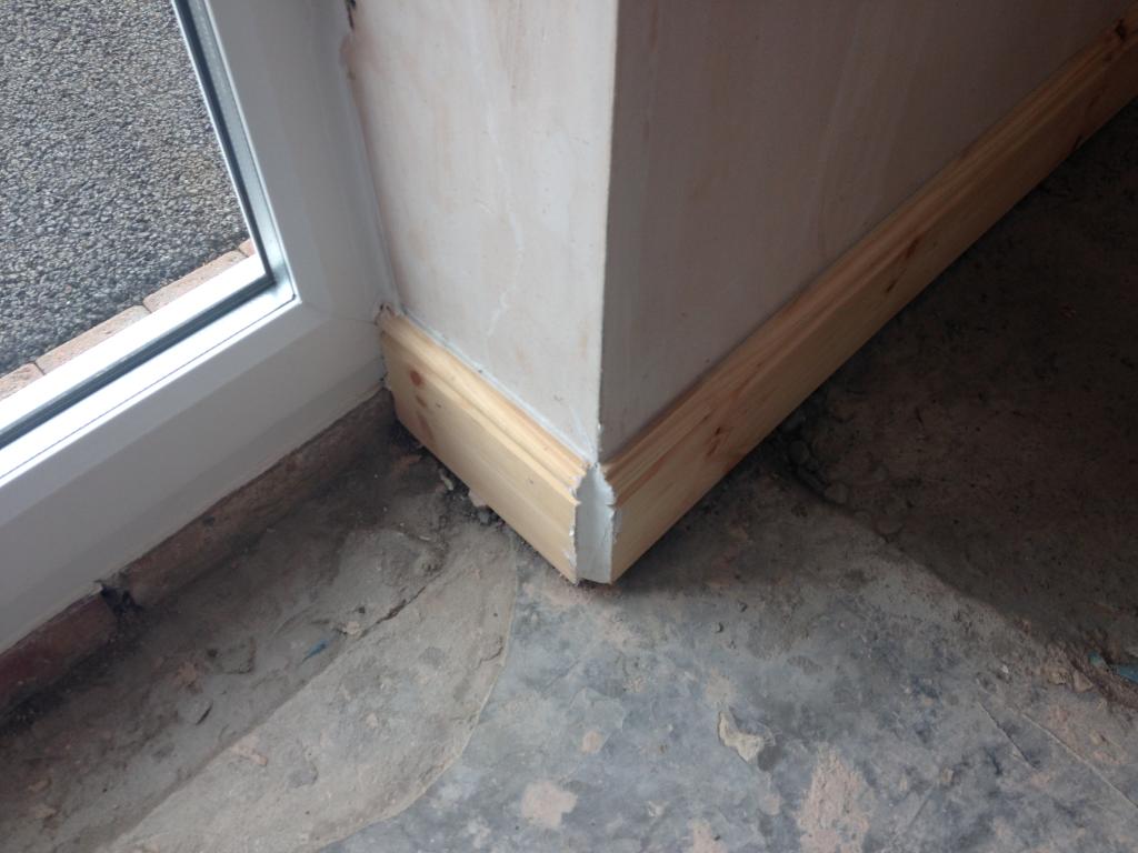 A wooden skirting board which should have been mitred at the angle so the two pieces of wood butted together.