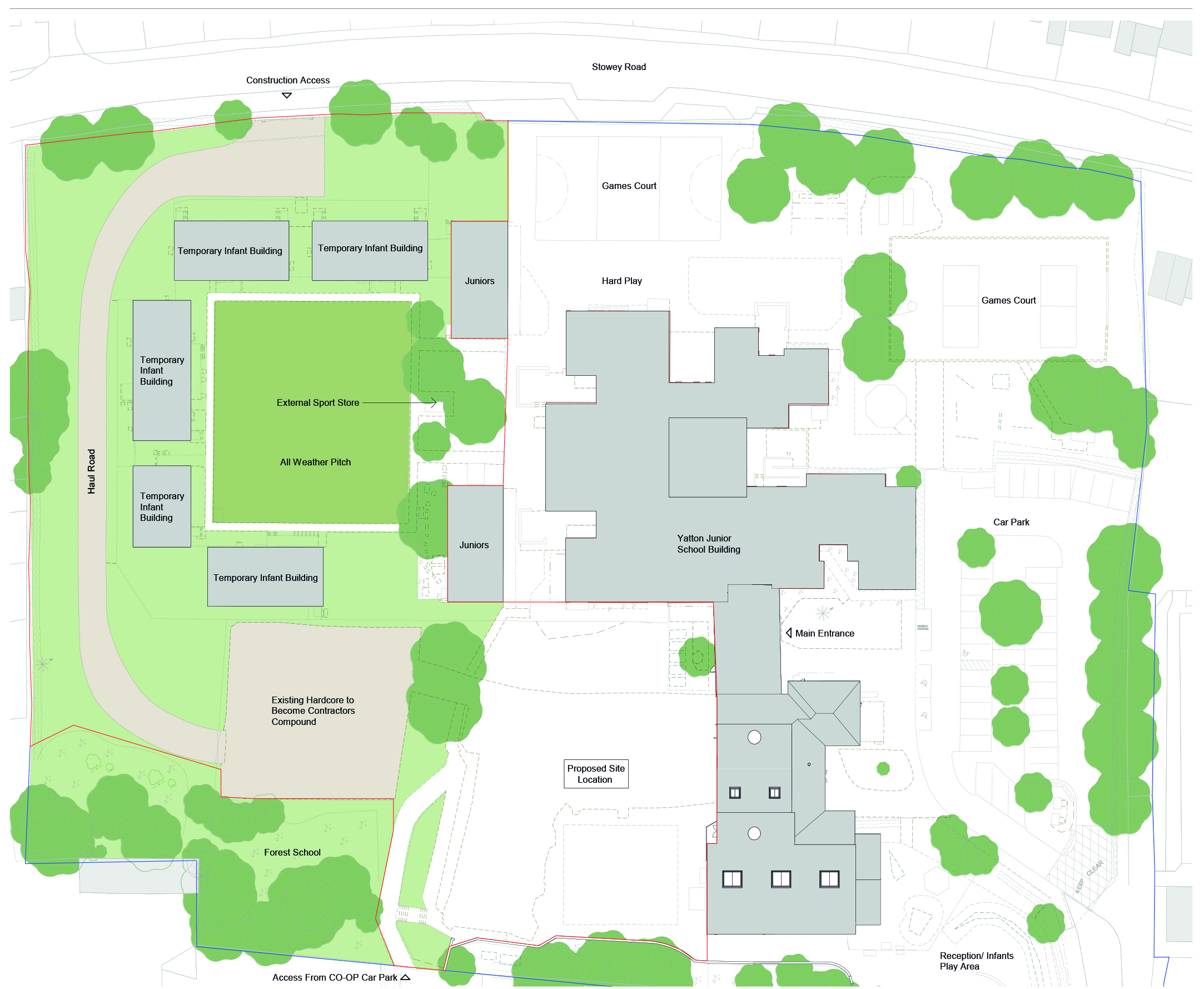 The temporary classrooms that were set up following the fire, including the temporary access road, will be removed and the temporary school will be relocated to the playing field.