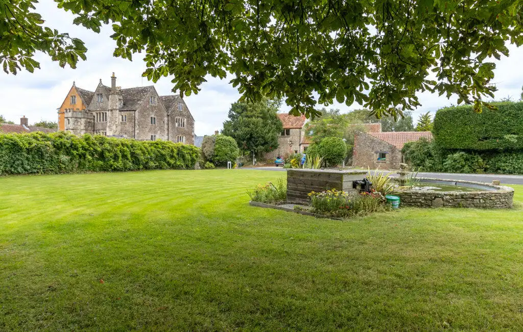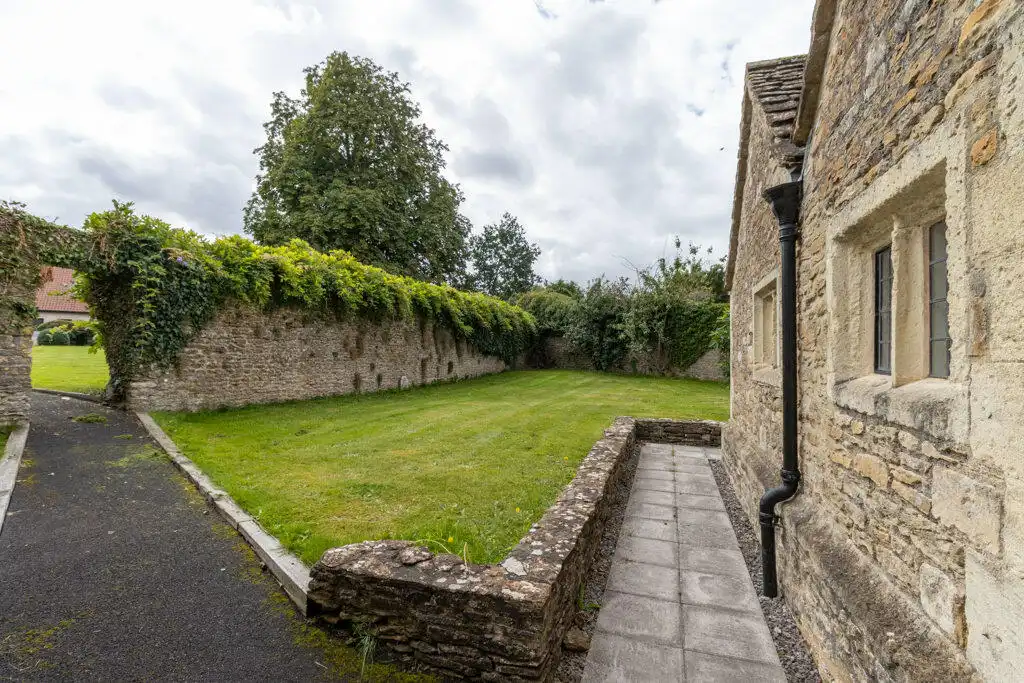 “To the immediate rear of the building there is an enclosed lawned garden with stone outbuilding and to the south a large lawn with feature pond.