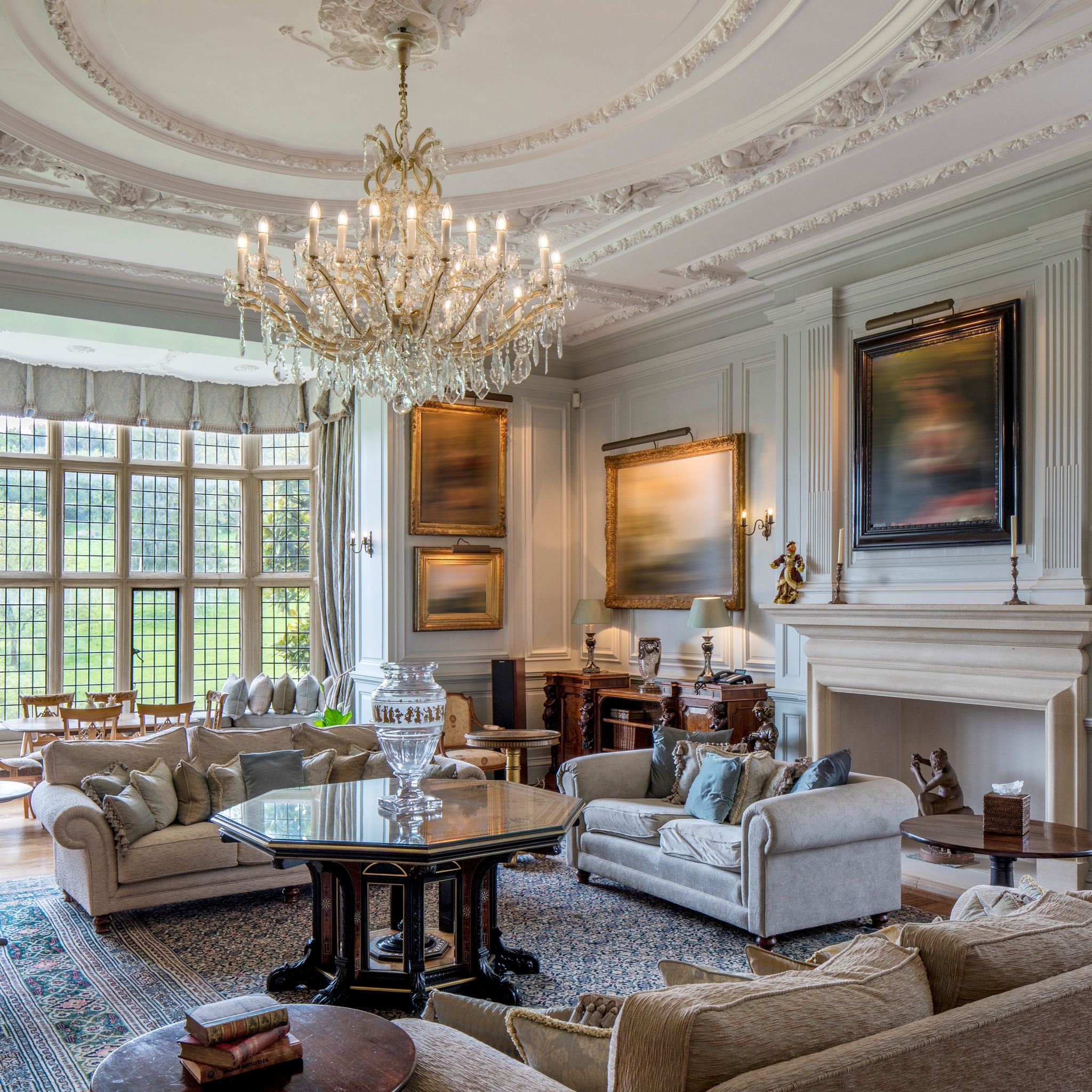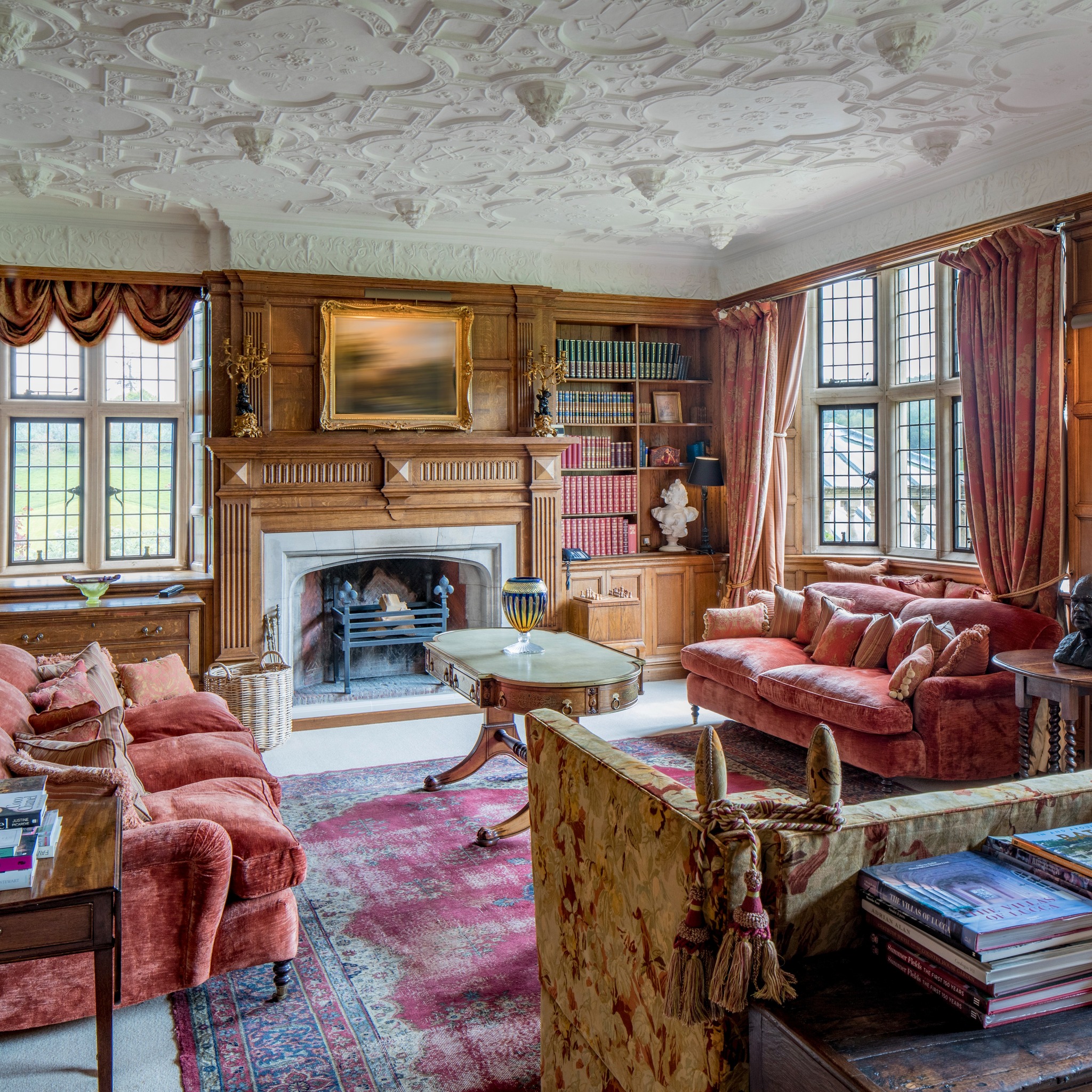 “Ornate plasterwork ceilings with intricate carvings, ancient wood panelled rooms, stone mullioned leaded light windows (some with stained glass detail), coffered ceilings, ancient oak floors and staircases and huge fireplaces all feature and speak of the stories this house has to tell.