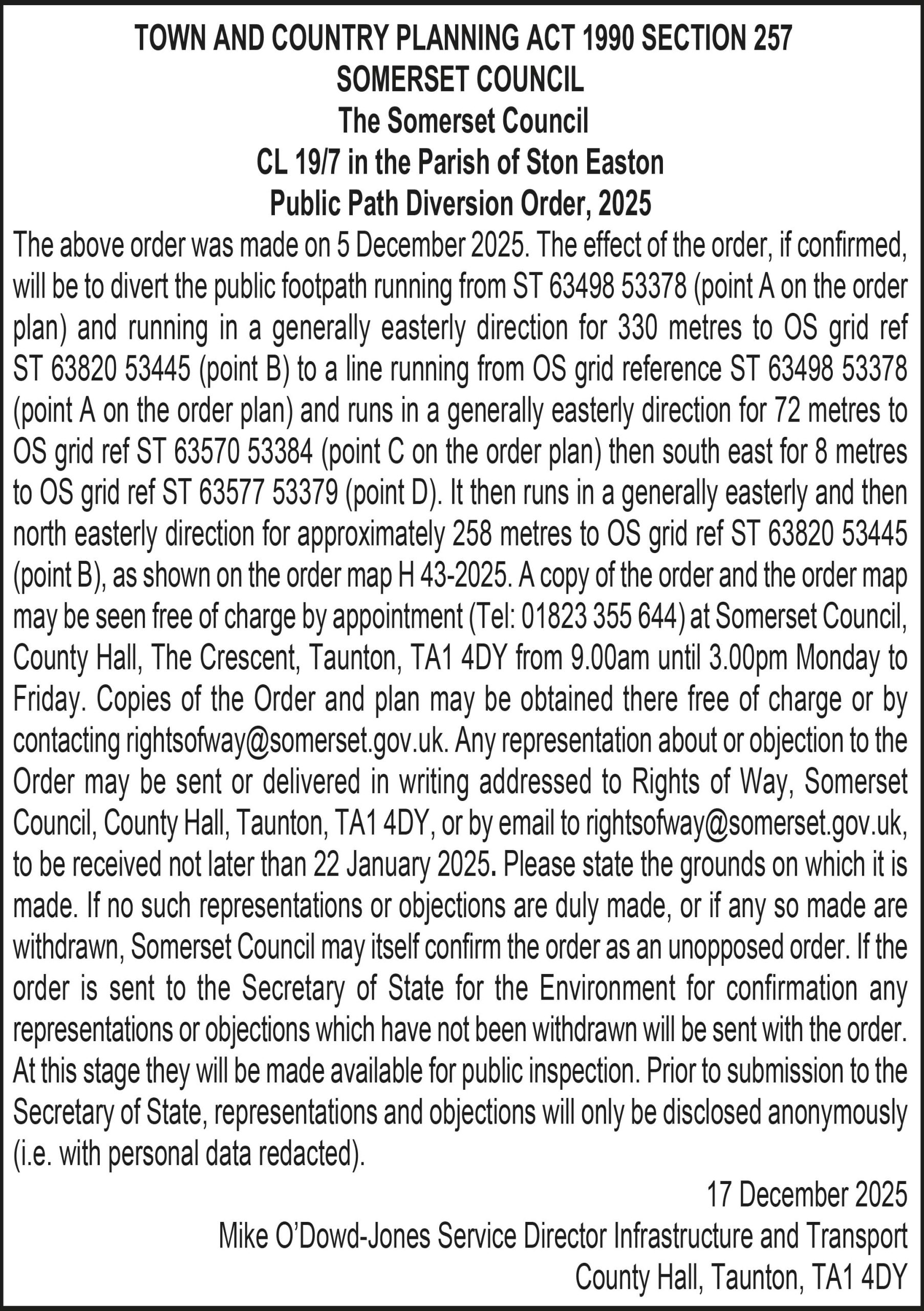 The above order was made on 5 December 2025. The effect of the order, if confirmed, will be to divert the public footpath running from ST 63498 53378 (point A on the order plan) and running in a generally easterly direction for 330 metres to OS grid ref ST 63820 53445 (point B) to a line running from OS grid reference ST 63498 53378 (point A on the order plan) and runs in a generally easterly direction for 72 metres to OS grid ref ST 63570 53384 (point C on the order plan) then south east for 8 metres to OS grid ref ST 63577 53379 (point D). It then runs in a generally easterly and then north easterly direction for approximately 258 metres to OS grid ref ST 63820 53445 (point B), as shown on the order map H 43-2025. A copy of the order and the order map may be seen free of charge by appointment (Tel: 01823 355 644) at Somerset Council, County Hall, The Crescent, Taunton, TA1 4DY from 9.00am until 3.00pm Monday to Friday. Copies of the Order and plan may be obtained there free of charge or by contacting rightsofway@somerset.gov.uk. Any representation about or objection to the Order may be sent or delivered in writing addressed to Rights of Way, Somerset Council, County Hall, Taunton, TA1 4DY, or by email to rightsofway@somerset.gov.uk, to be received not later than 22 January 2025. Please state the grounds on which it is made. If no such representations or objections are duly made, or if any so made are withdrawn, Somerset Council may itself confirm the order as an unopposed order. If the order is sent to the Secretary of State for the Environment for confirmation any representations or objections which have not been withdrawn will be sent with the order.