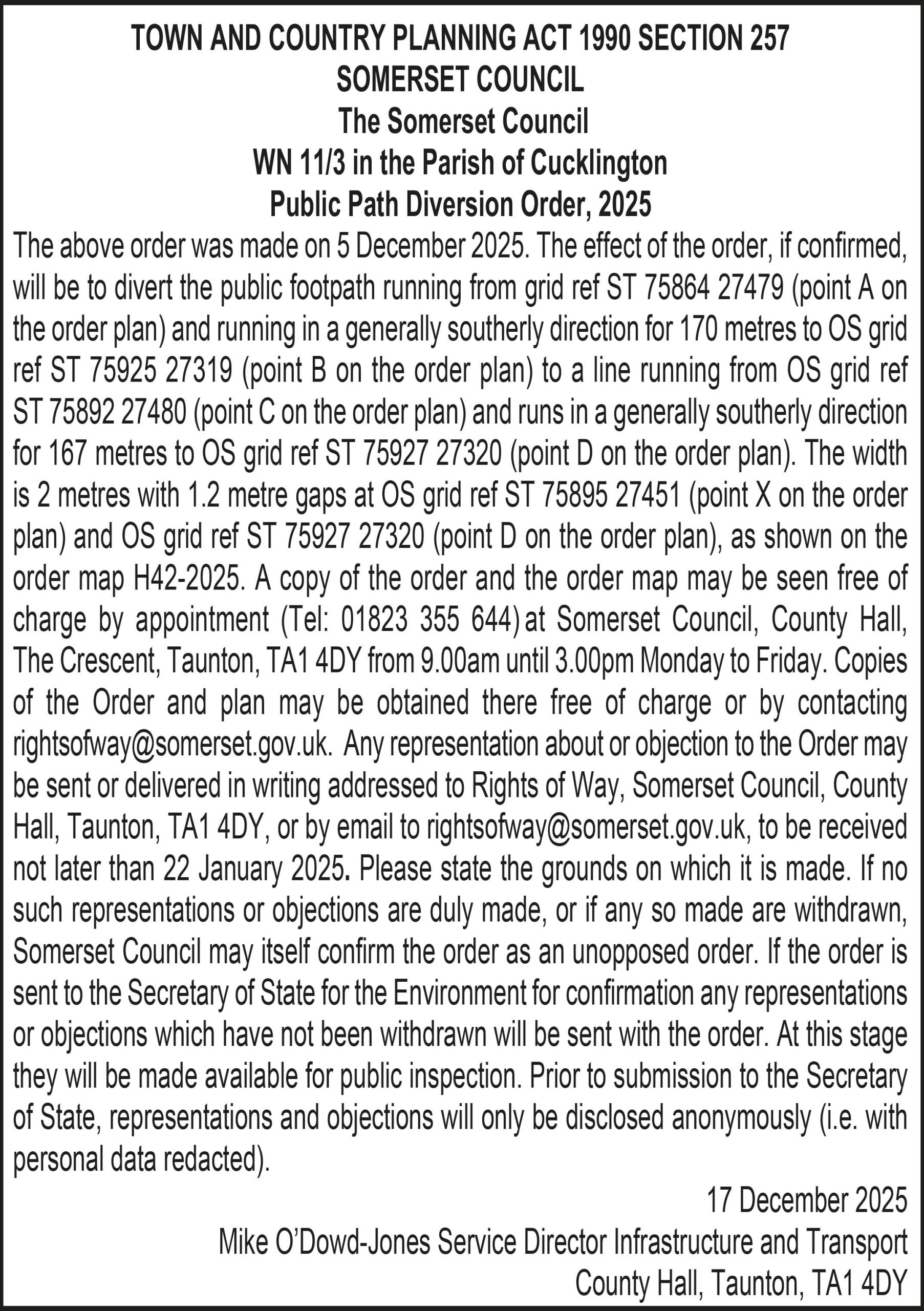 The above order was made on 5 December 2025. The effect of the order, if confirmed, will be to divert the public footpath running from grid ref ST 75864 27479 (point A on the order plan) and running in a generally southerly direction for 170 metres to OS grid ref ST 75925 27319 (point B on the order plan) to a line running from OS grid ref ST 75892 27480 (point C on the order plan) and runs in a generally southerly direction for 167 metres to OS grid ref ST 75927 27320 (point D on the order plan). The width is 2 metres with 1.2 metre gaps at OS grid ref ST 75895 27451 (point X on the order plan) and OS grid ref ST 75927 27320 (point D on the order plan), as shown on the order map H42-2025. A copy of the order and the order map may be seen free of charge by appointment (Tel: 01823 355 644) at Somerset Council, County Hall, The Crescent, Taunton, TA1 4DY from 9.00am until 3.00pm Monday to Friday. Copies of the Order and plan may be obtained there free of charge or by contacting rightsofway@somerset.gov.uk. Any representation about or objection to the Order may be sent or delivered in writing addressed to Rights of Way, Somerset Council, County Hall, Taunton, TA1 4DY, or by email to rightsofway@somerset.gov.uk, to be received not later than 22 January 2025. Please state the grounds on which it is made. If no such representations or objections are duly made, or if any so made are withdrawn, Somerset Council may itself confirm the order as an unopposed order. If the order is sent to the Secretary of State for the Environment for confirmation any representations or objections which have not been withdrawn will be sent with the order. At this stage they will be made available for public inspection. Prior to submission to the Secretary of State, representations and objections will only be disclosed anonymously (i.e. with personal data redacted).