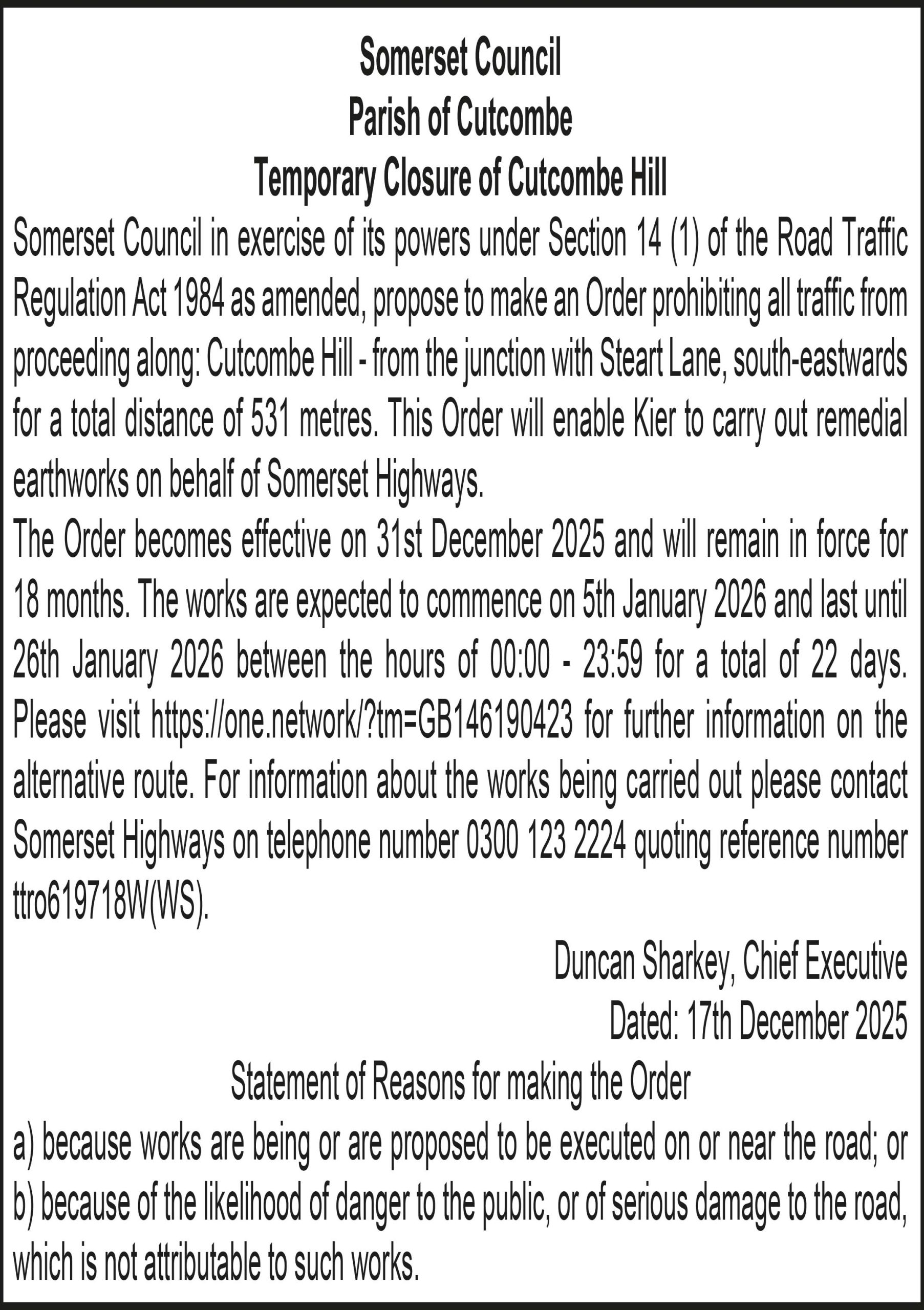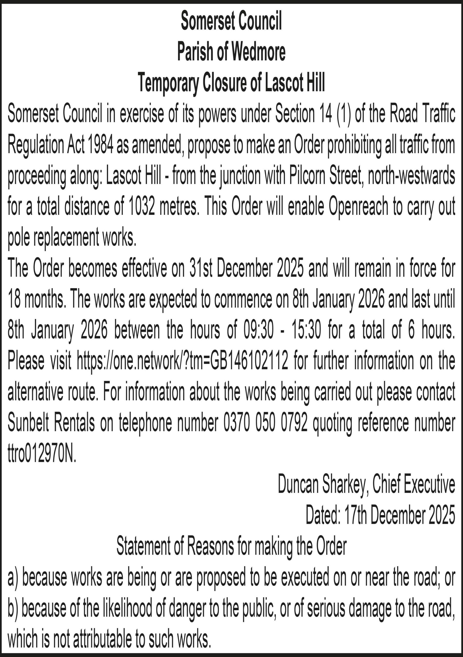 Somerset Council in exercise of its powers under Section 14 (1) of the Road Traffic Regulation Act 1984 as amended, propose to make an Order prohibiting all traffic from proceeding along: Lascot Hill – from the junction with Pilcorn Street, north-westwards for a total distance of 1032 metres. This Order will enable Openreach to carry out pole replacement works.