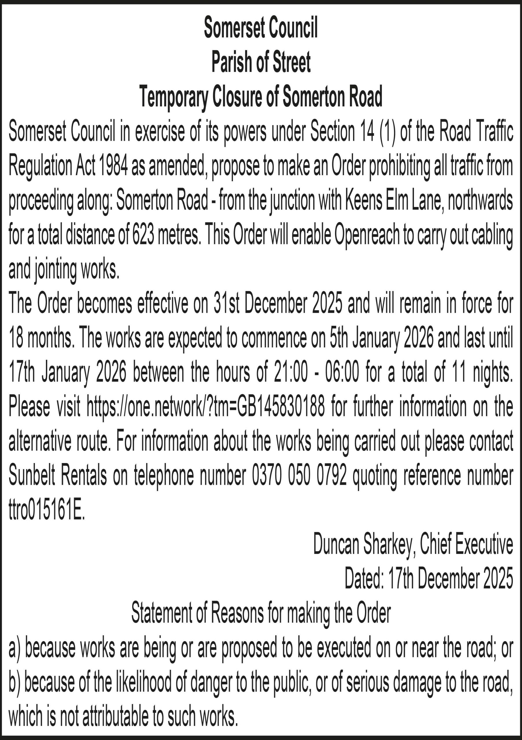 Somerset Council in exercise of its powers under Section 14 (1) of the Road Traffic Regulation Act 1984 as amended, propose to make an Order prohibiting all traffic from proceeding along: Somerton Road – from the junction with Keens Elm Lane, northwards for a total distance of 623 metres. This Order will enable Openreach to carry out cabling and jointing works.