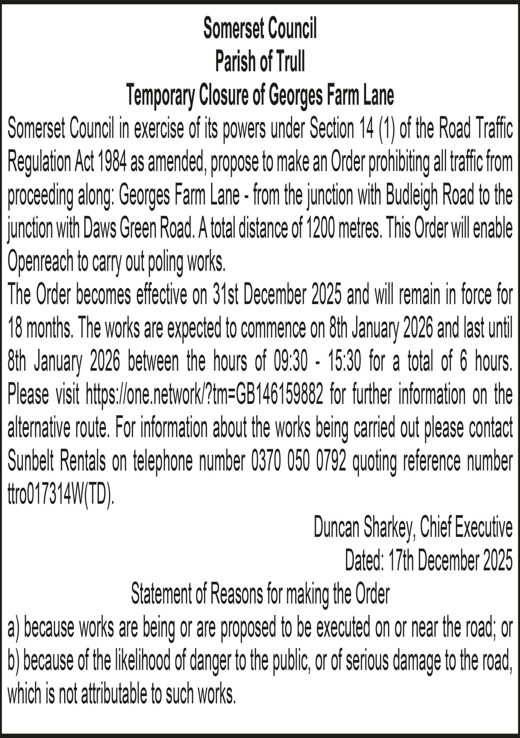 Somerset Council in exercise of its powers under Section 14 (1) of the Road Traffic Regulation Act 1984 as amended, propose to make an Order prohibiting all traffic from proceeding along: Georges Farm Lane – from the junction with Budleigh Road to the junction with Daws Green Road. A total distance of 1200 metres. This Order will enable Openreach to carry out poling works.