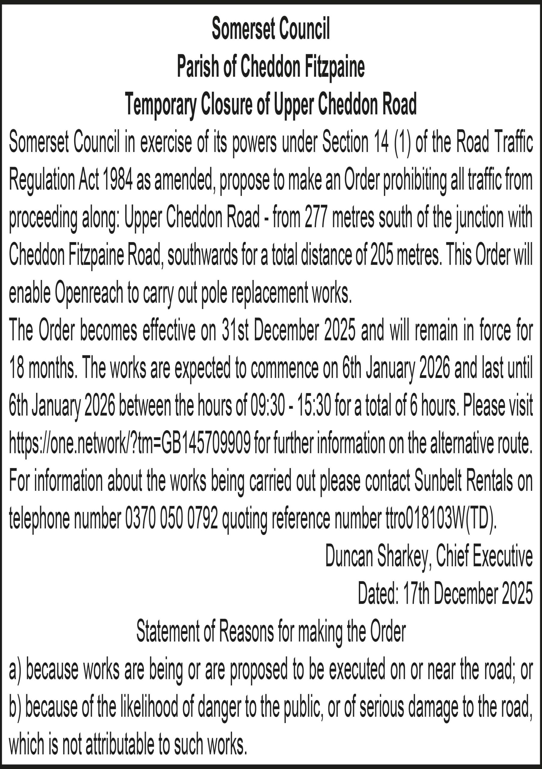 Somerset Council in exercise of its powers under Section 14 (1) of the Road Traffic Regulation Act 1984 as amended, propose to make an Order prohibiting all traffic from proceeding along: Upper Cheddon Road – from 277 metres south of the junction with Cheddon Fitzpaine Road, southwards for a total distance of 205 metres. This Order will enable Openreach to carry out pole replacement works.