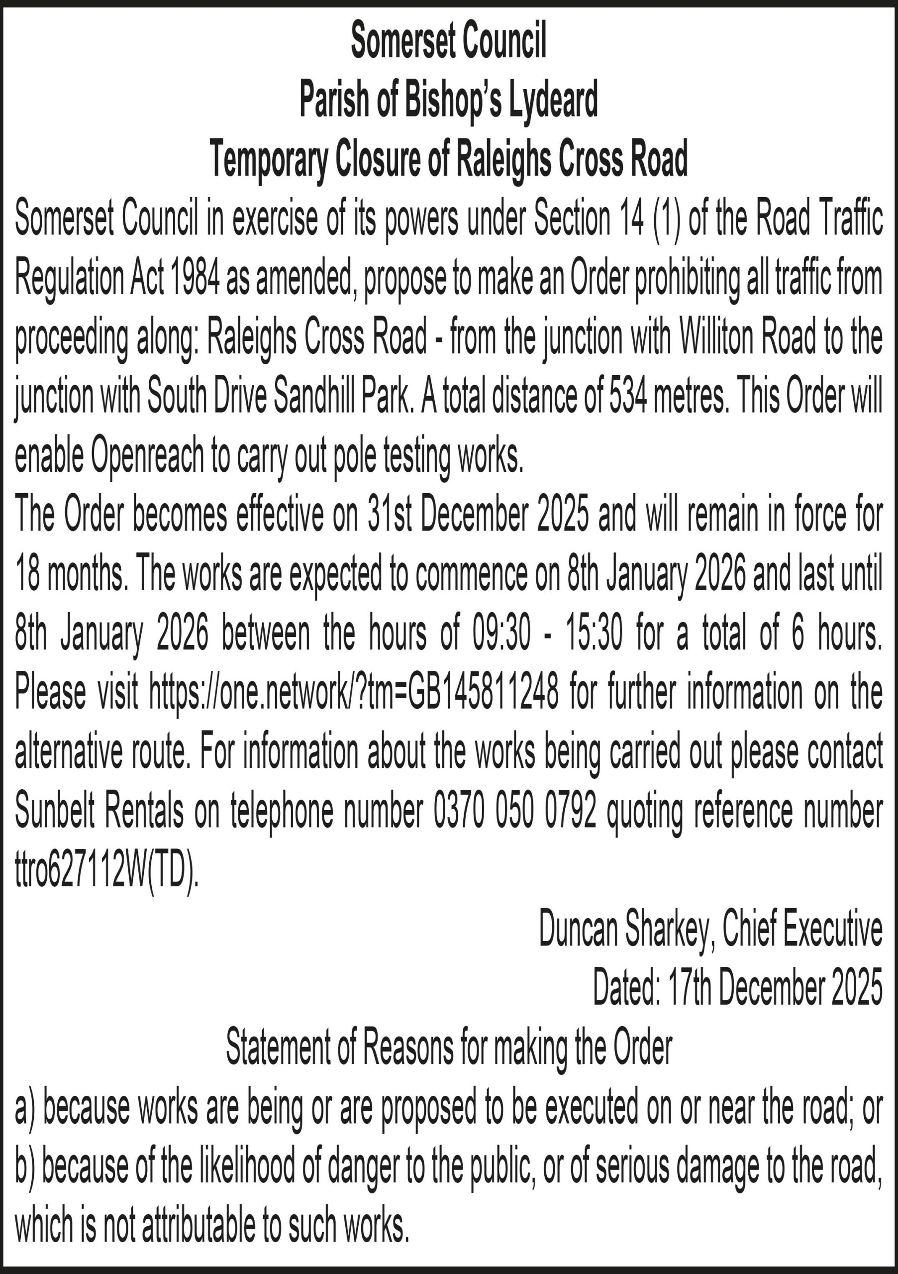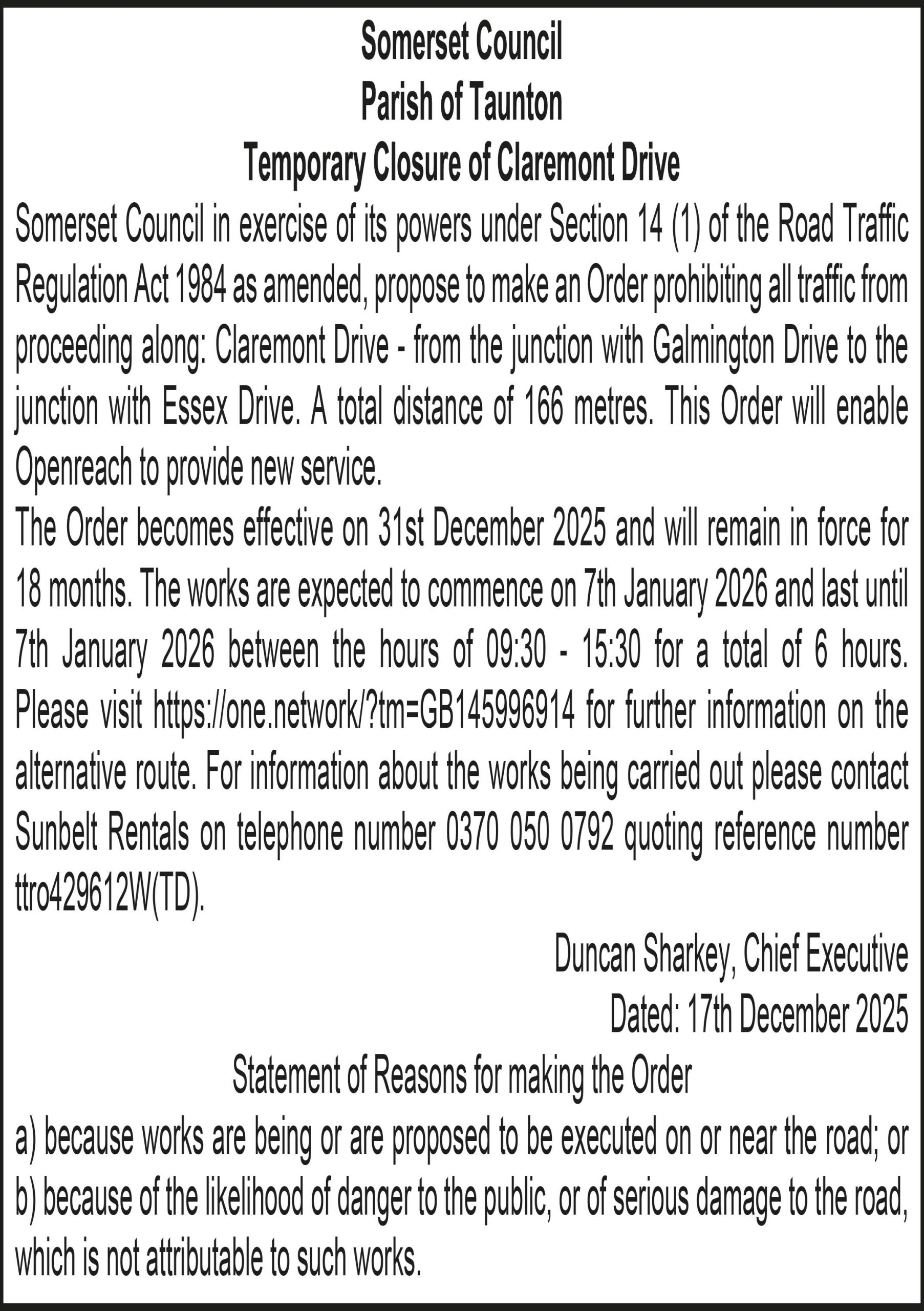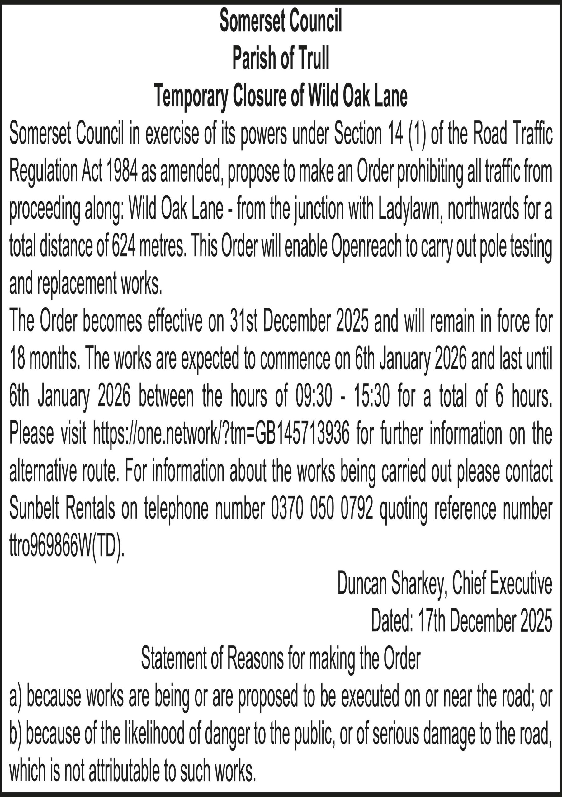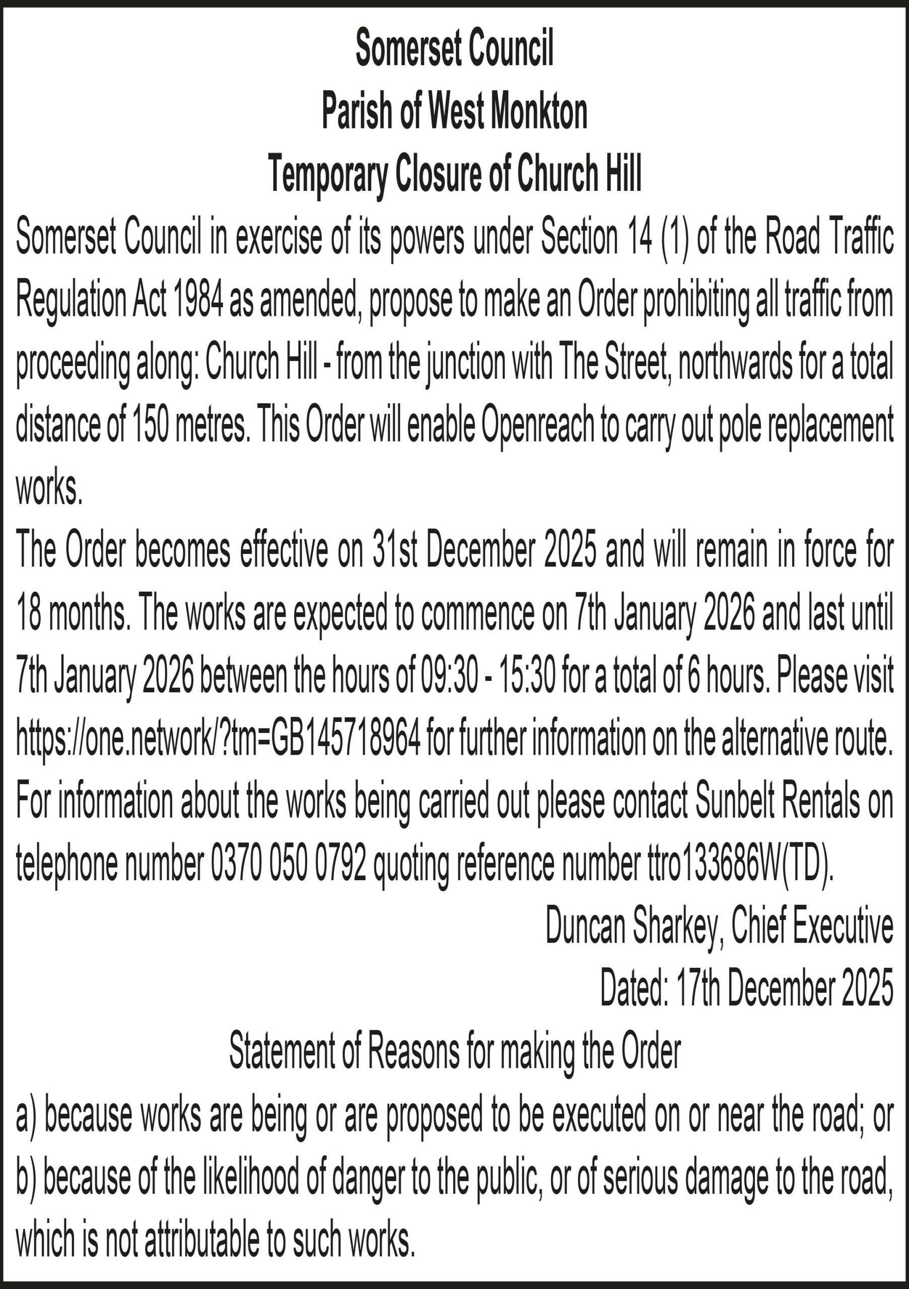 The Order becomes effective on 31st December 2025 and will remain in force for 18 months. The works are expected to commence on 8th January 2026 and last until 8th January 2026 between the hours of 09:30 – 15:30 for a total of 6 hours. Please visit for further information on the alternative route. For information about the works being carried out please contact Sunbelt Rentals on telephone number 0370 050 0792 quoting reference number ttro860899W(TD).