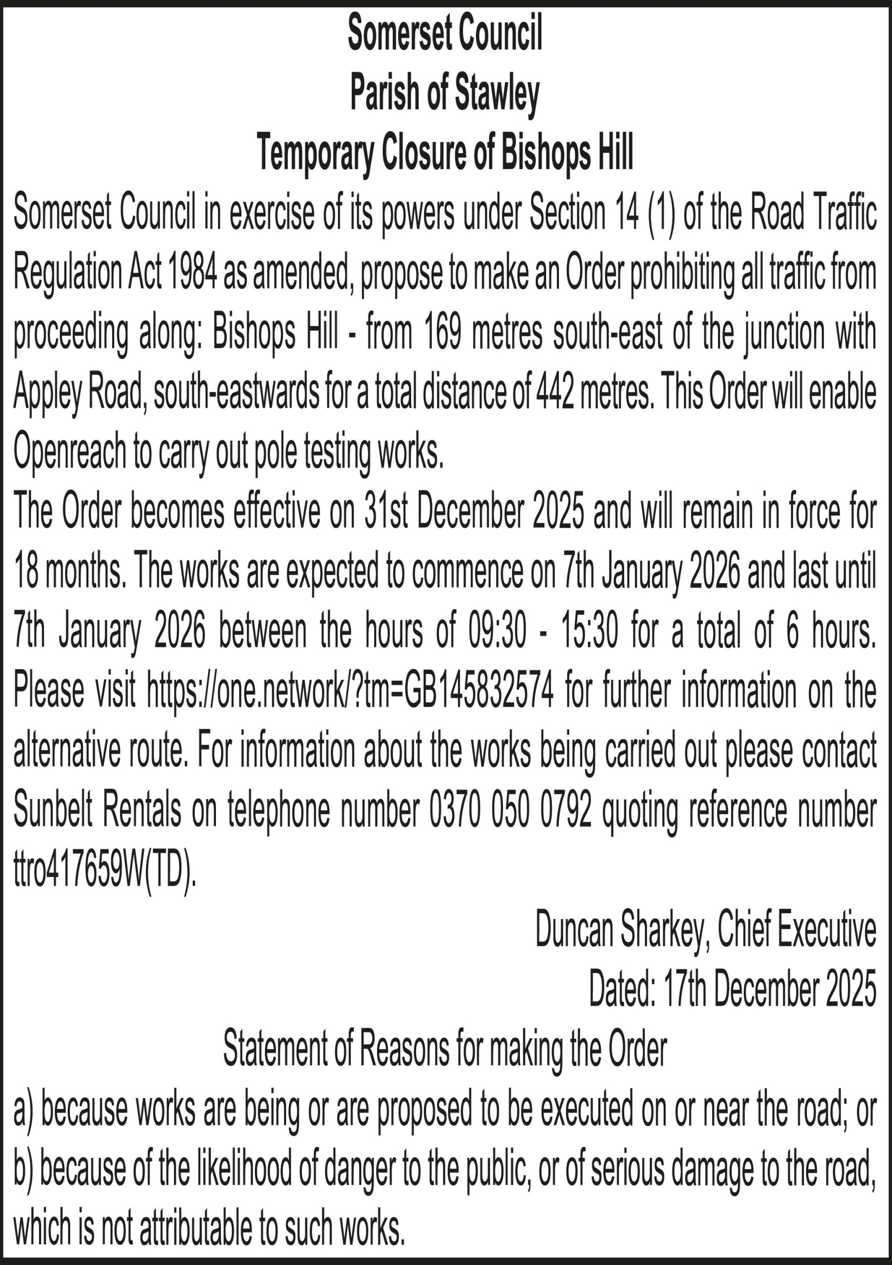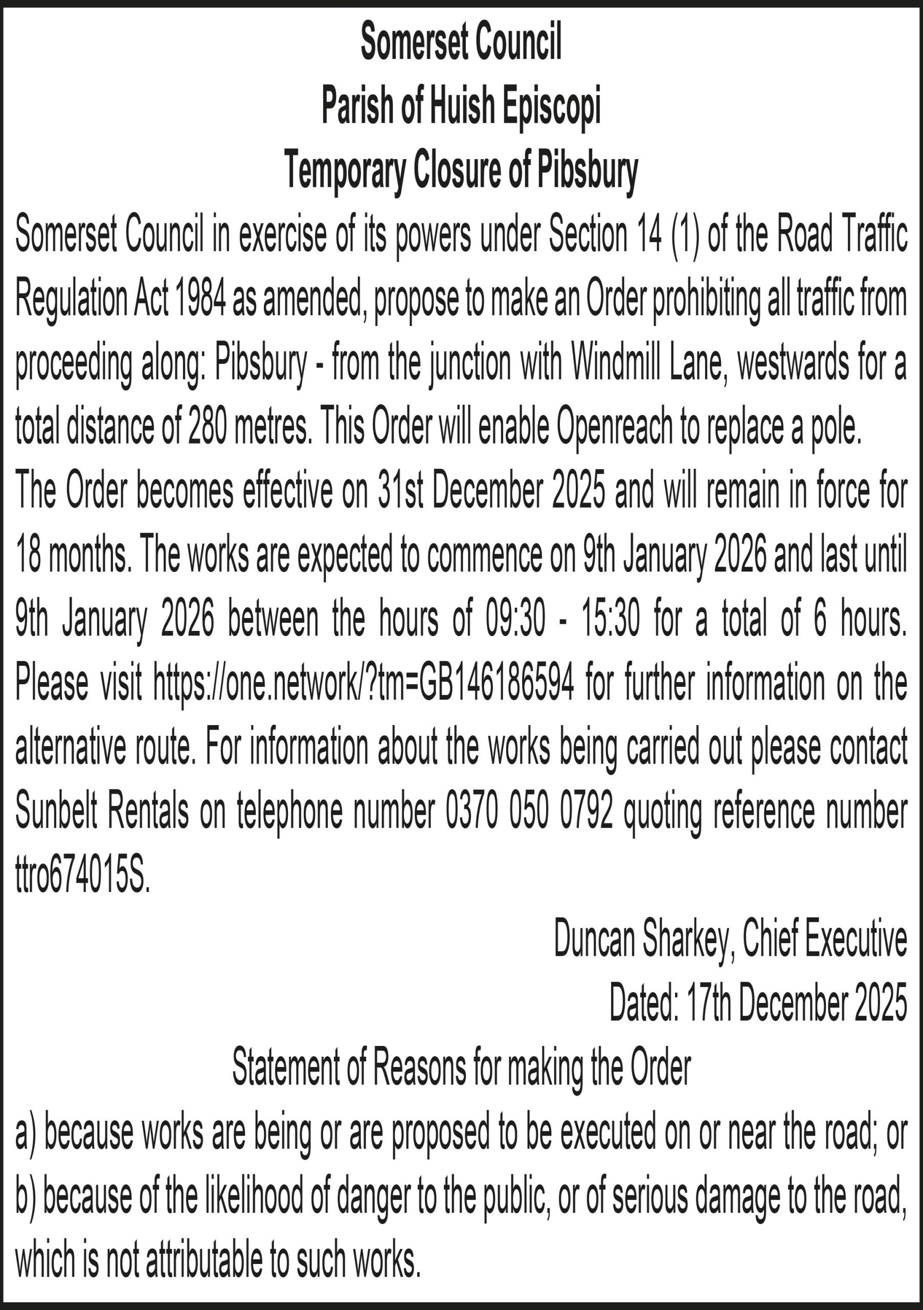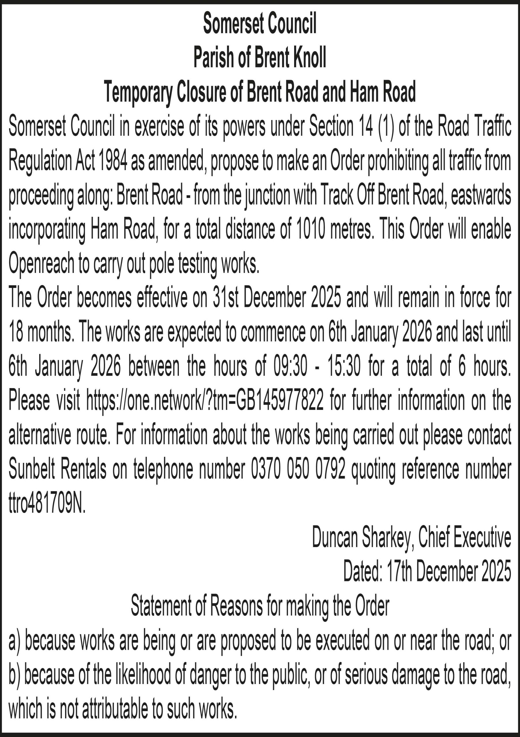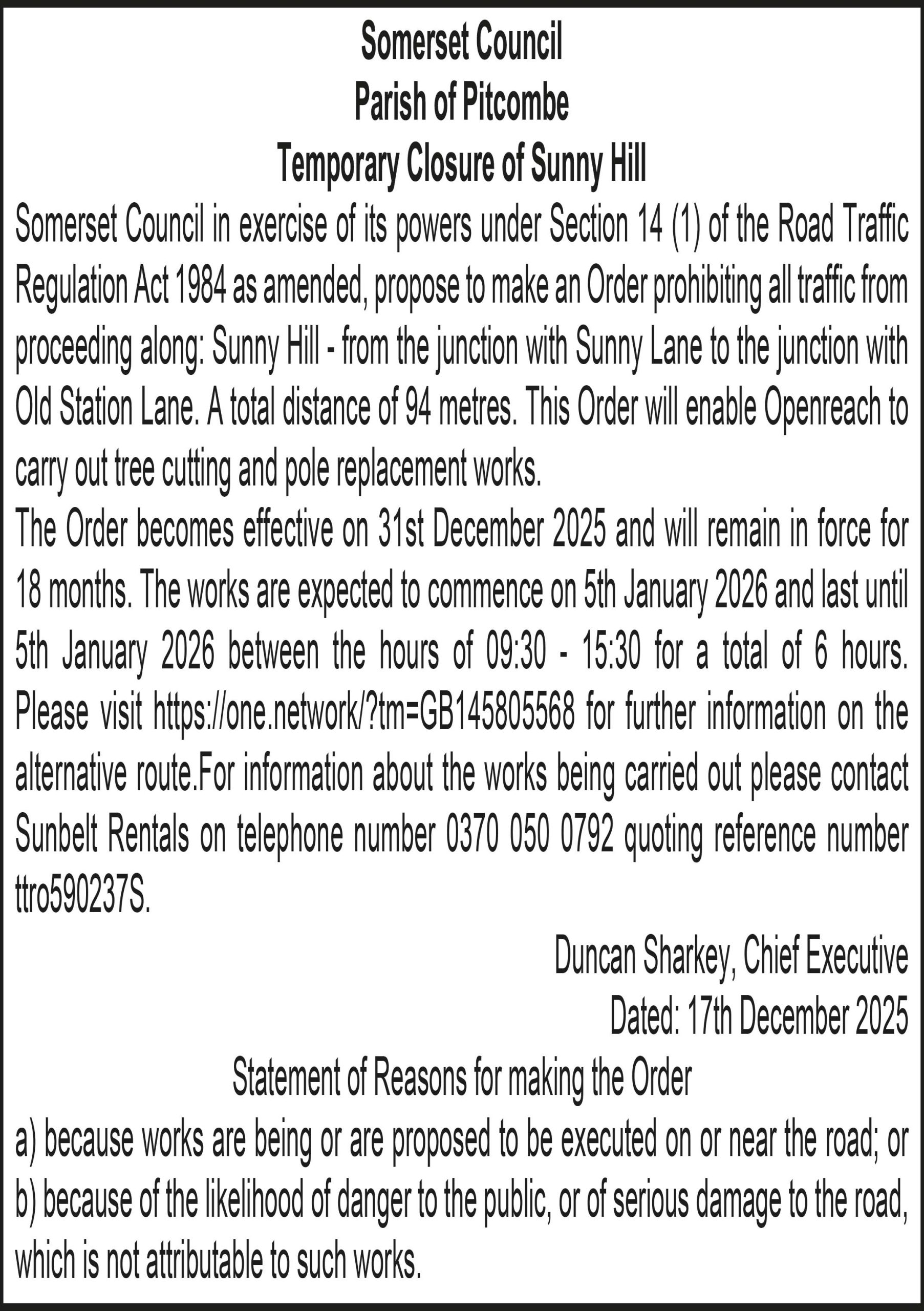 The Order becomes effective on 31st December 2025 and will remain in force for 18 months. The works are expected to commence on 8th January 2026 and last until 8th January 2026 between the hours of 09:30 – 15:30 for a total of 6 hours. Please visit for further information on the alternative route. For information about the works being carried out please contact Sunbelt Rentals on telephone number 0370 050 0792 quoting reference number ttro860899W(TD).
