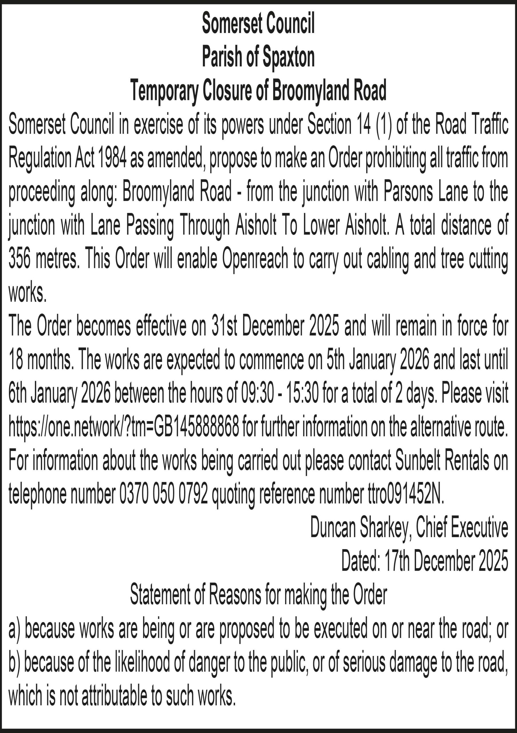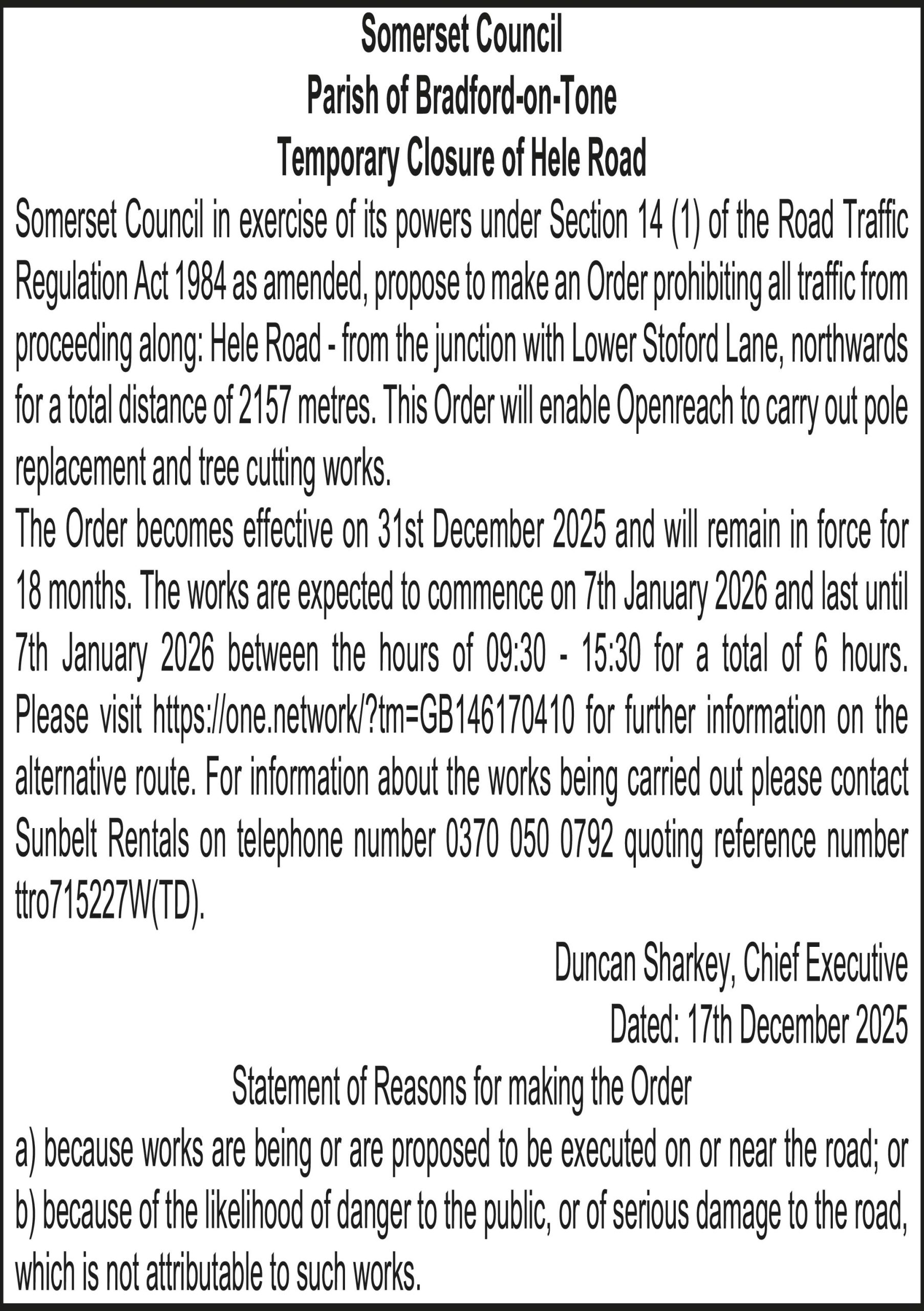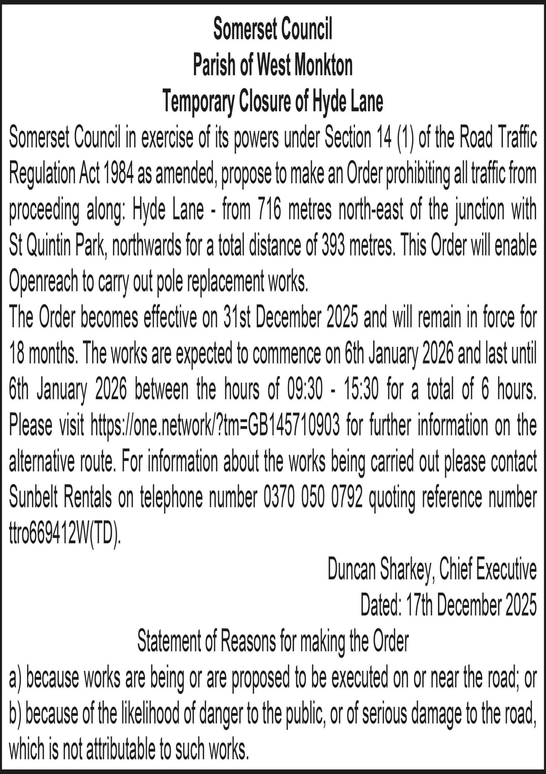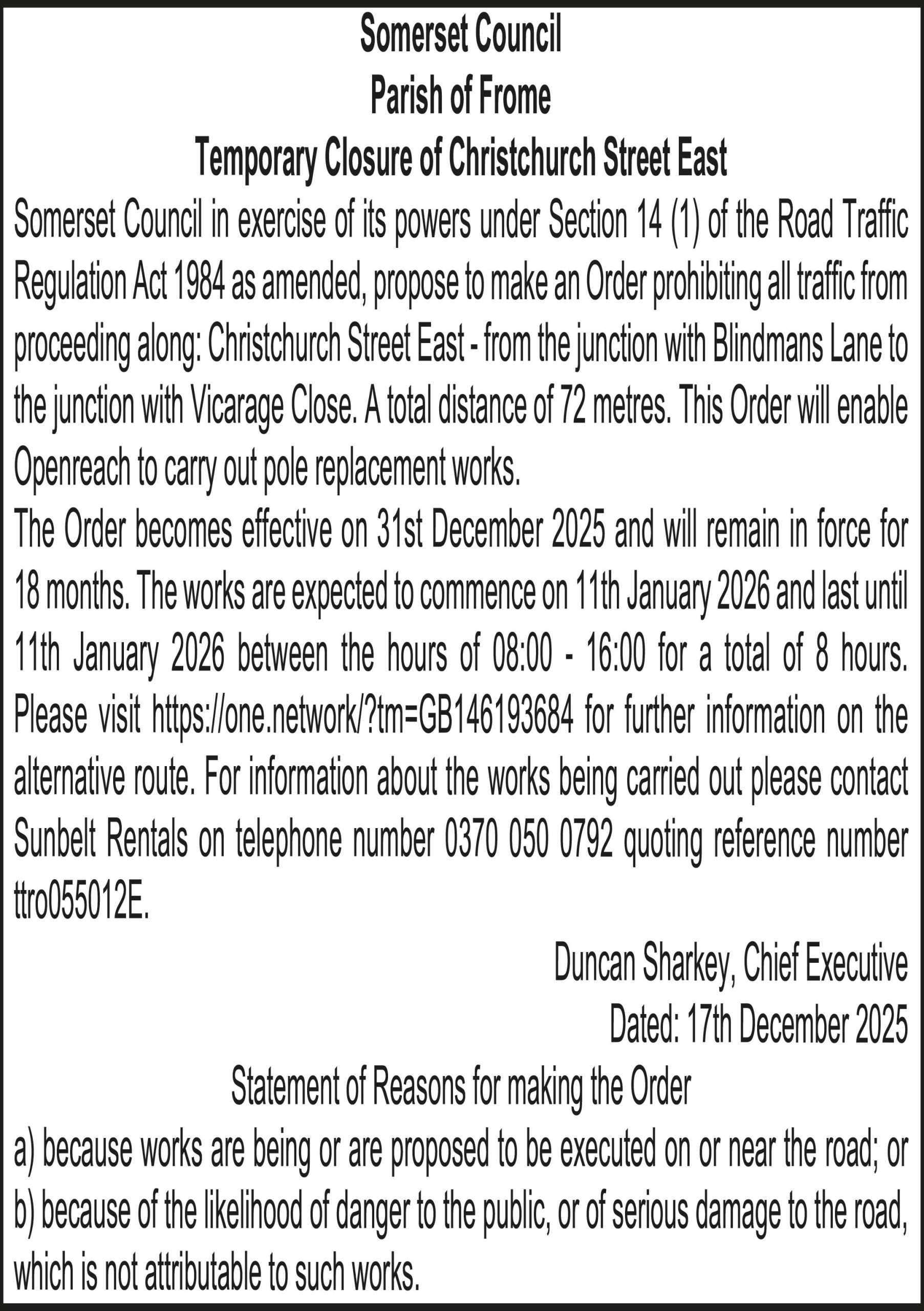 The Order becomes effective on 31st December 2025 and will remain in force for 18 months. The works are expected to commence on 8th January 2026 and last until 8th January 2026 between the hours of 09:30 – 15:30 for a total of 6 hours. Please visit for further information on the alternative route. For information about the works being carried out please contact Sunbelt Rentals on telephone number 0370 050 0792 quoting reference number ttro860899W(TD).