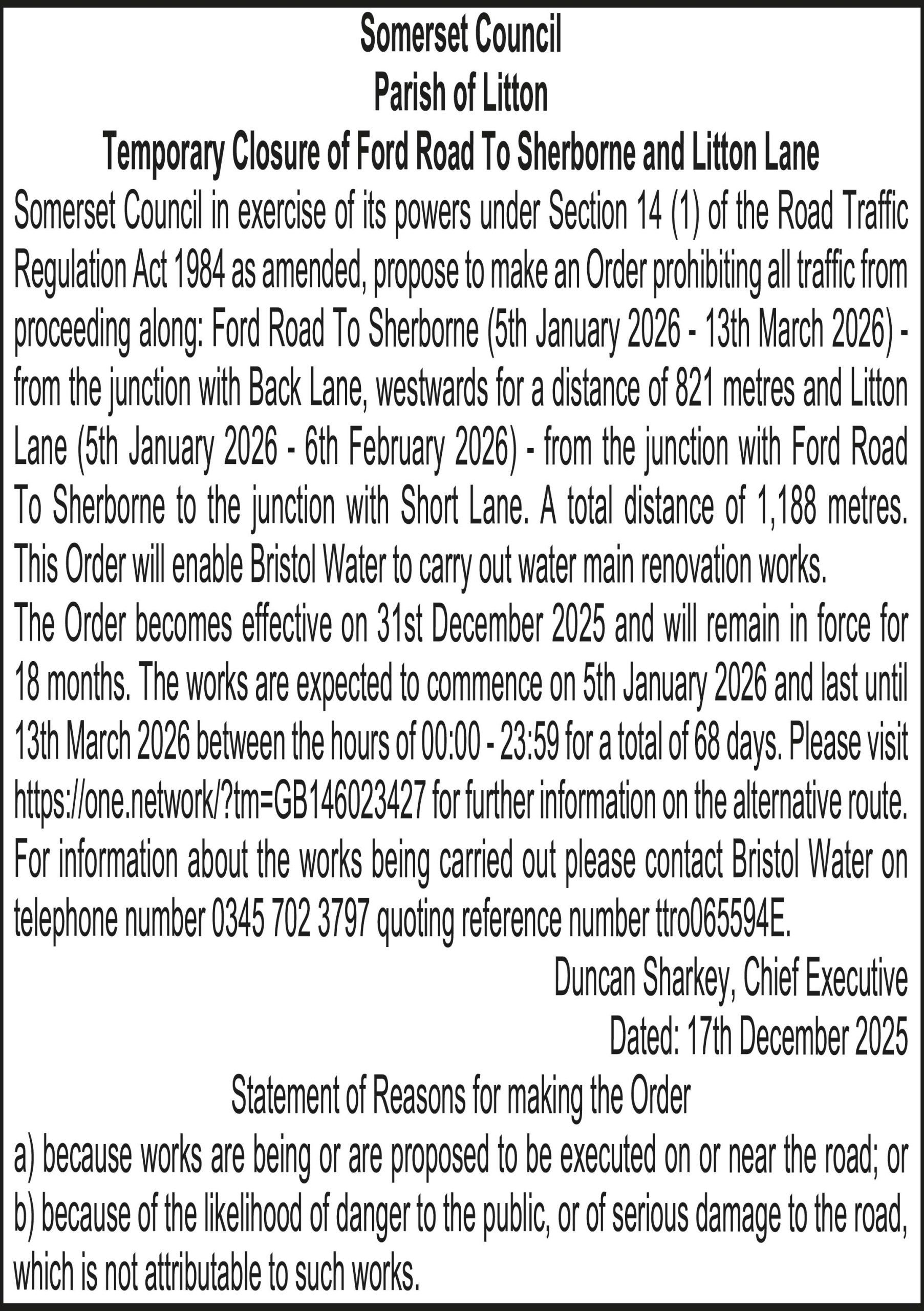 Somerset Council in exercise of its powers under Section 14 (1) of the Road Traffic Regulation Act 1984 as amended, propose to make an Order prohibiting all traffic from proceeding along: Ford Road To Sherborne (5th January 2026 – 13th March 2026) – from the junction with Back Lane, westwards for a distance of 821 metres and Litton Lane (5th January 2026 – 6th February 2026) – from the junction with Ford Road To Sherborne to the junction with Short Lane. A total distance of 1,188 metres. This Order will enable Bristol Water to carry out water main renovation works.