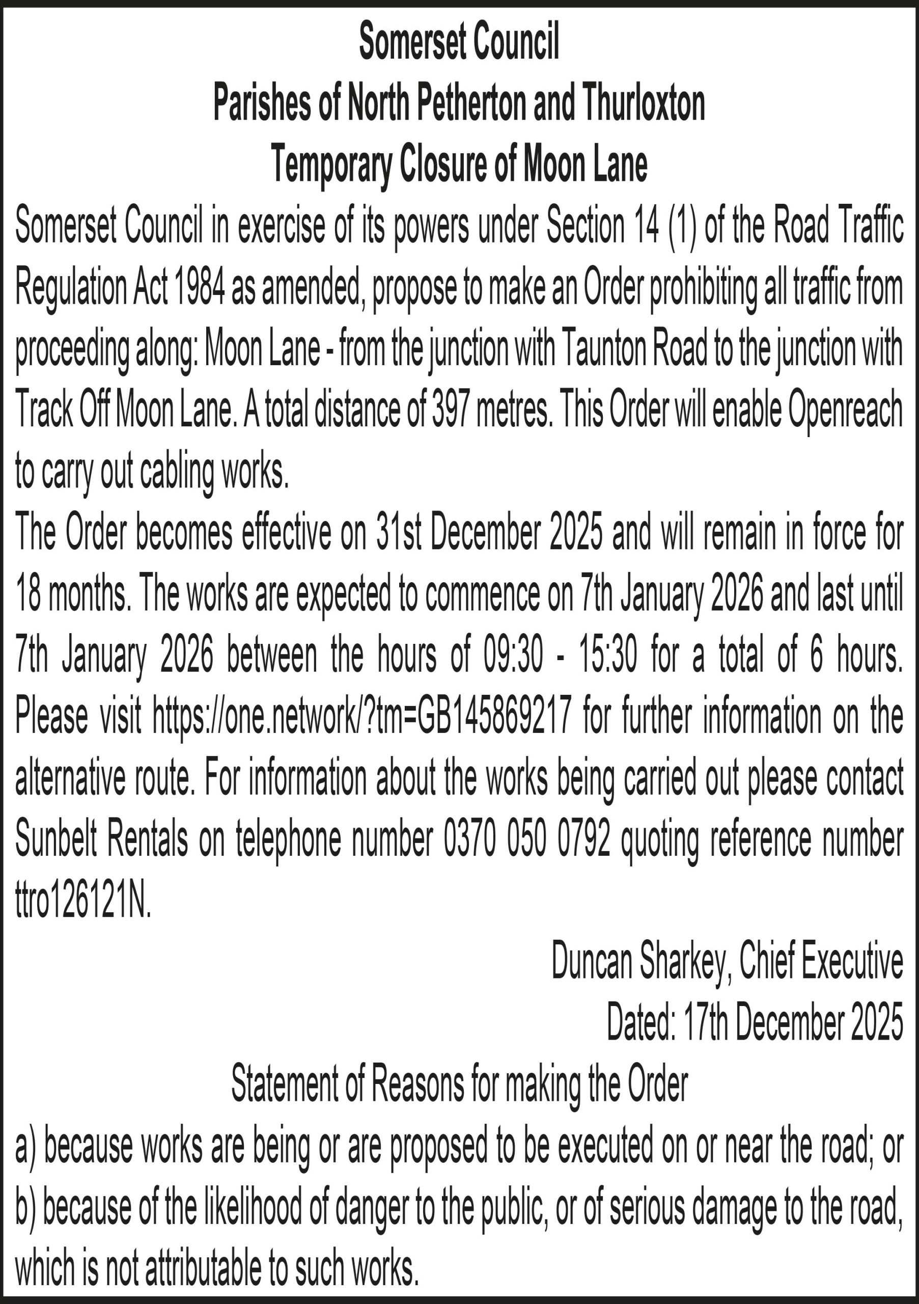 Somerset Council in exercise of its powers under Section 14 (1) of the Road Traffic Regulation Act 1984 as amended, propose to make an Order prohibiting all traffic from proceeding along: Moon Lane – from the junction with Taunton Road to the junction with Track Off Moon Lane. A total distance of 397 metres. This Order will enable Openreach to carry out cabling works.