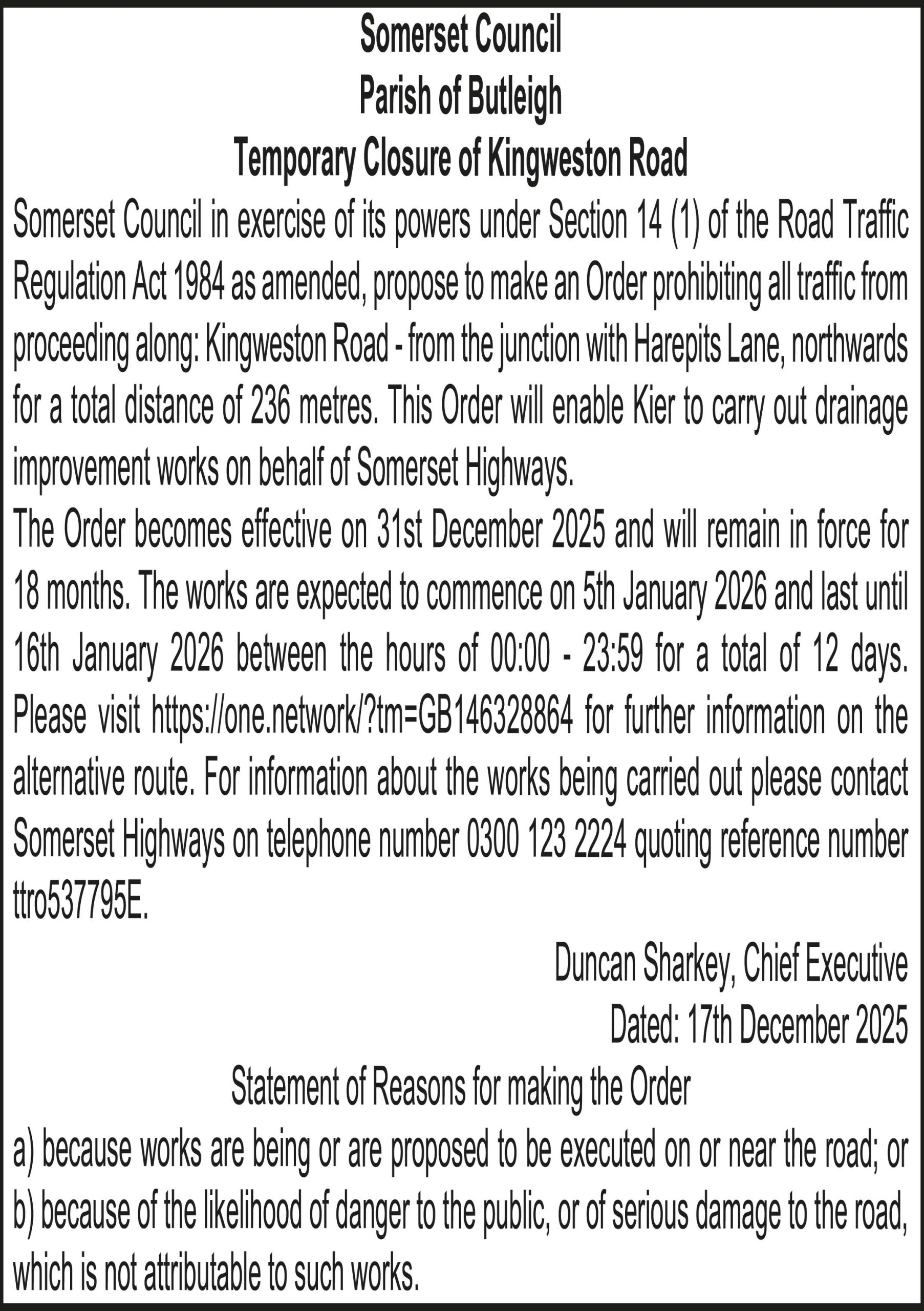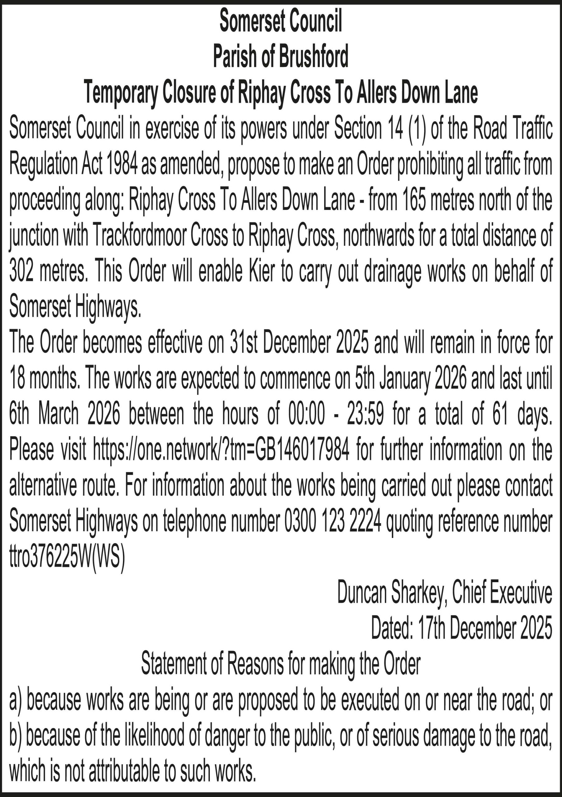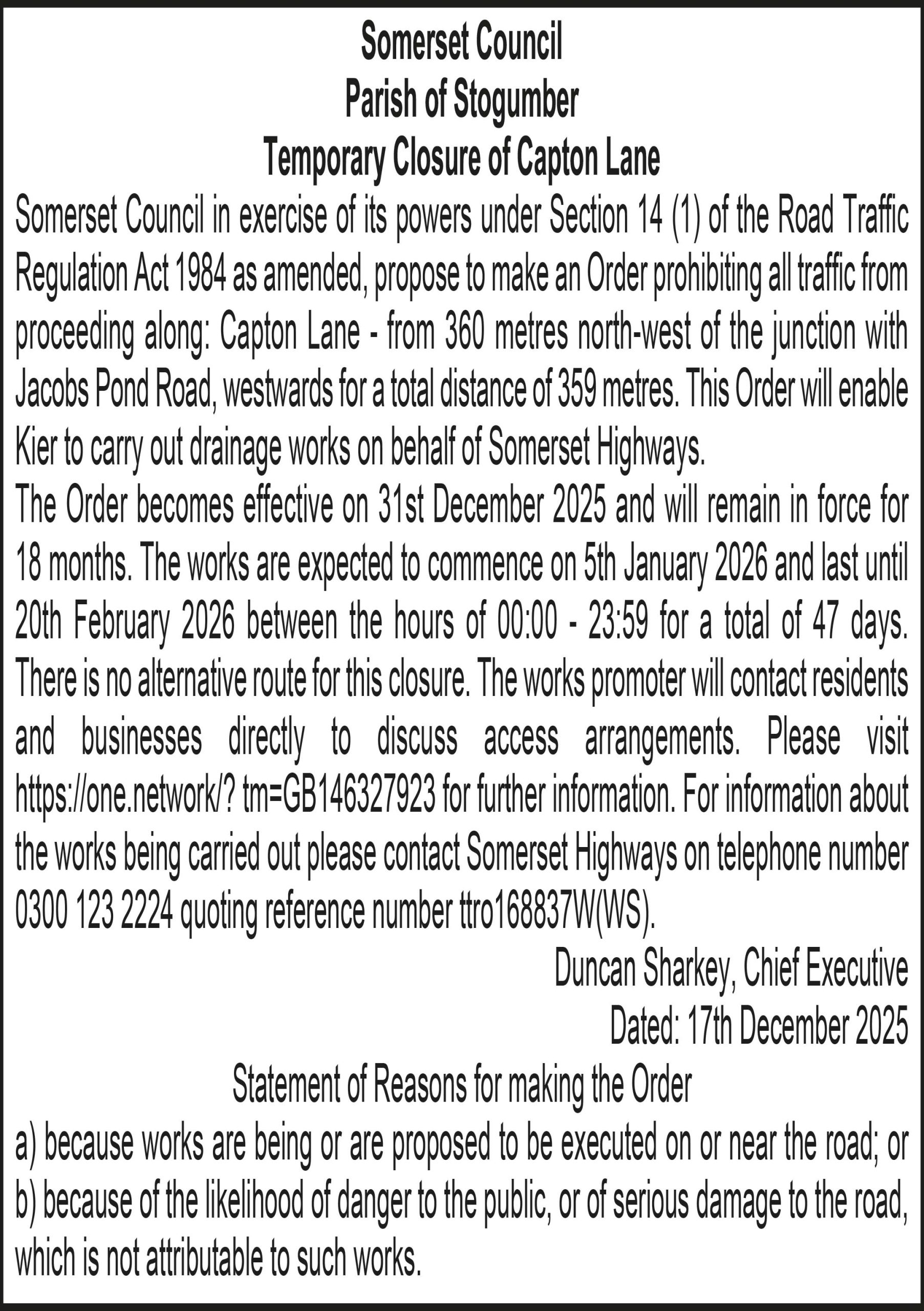 Somerset Council in exercise of its powers under Section 14 (1) of the Road Traffic Regulation Act 1984 as amended, propose to make an Order prohibiting all traffic from proceeding along: Capton Lane – from 360 metres north-west of the junction with Jacobs Pond Road, westwards for a total distance of 359 metres. This Order will enable Kier to carry out drainage works on behalf of Somerset Highways.