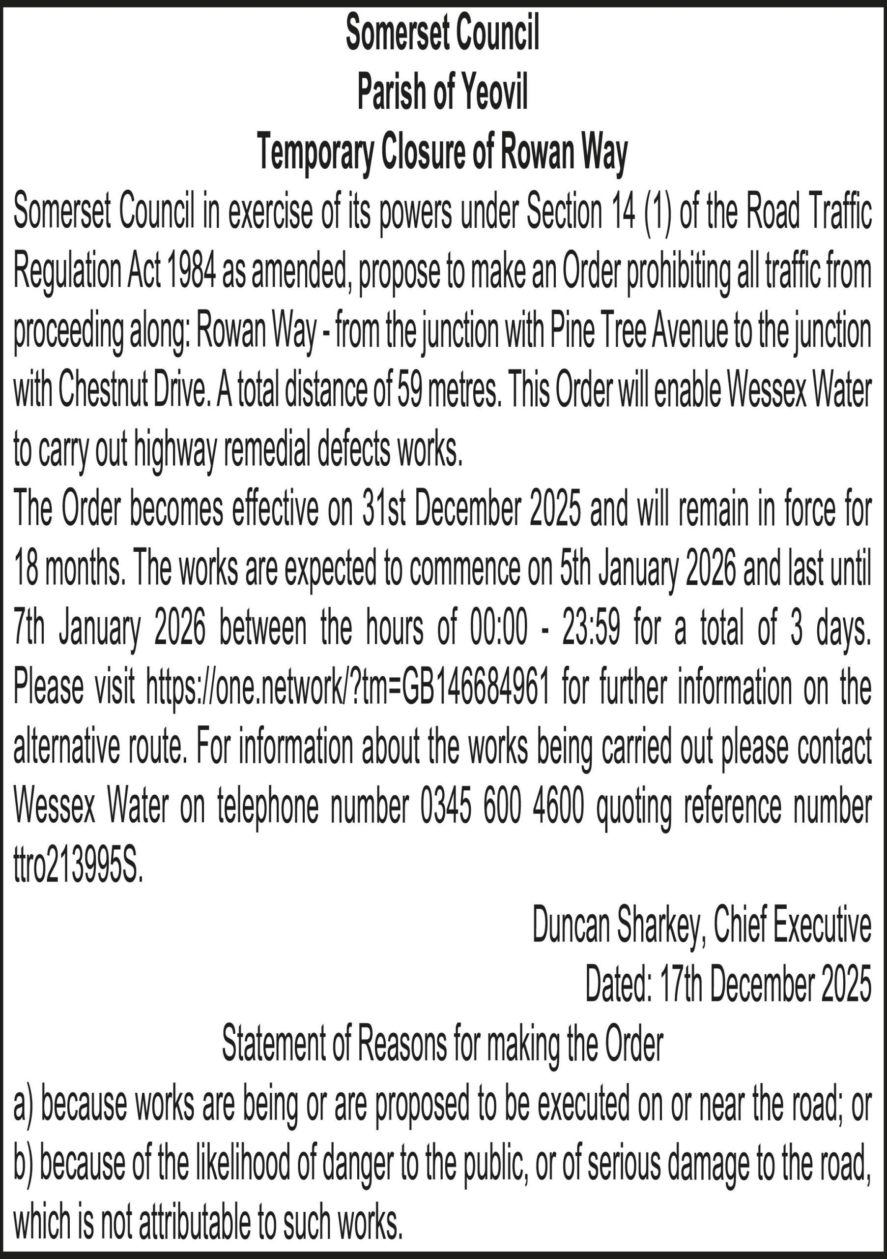 Somerset Council in exercise of its powers under Section 14 (1) of the Road Traffic Regulation Act 1984 as amended, propose to make an Order prohibiting all traffic from proceeding along: Rowan Way – from the junction with Pine Tree Avenue to the junction with Chestnut Drive. A total distance of 59 metres. This Order will enable Wessex Water to carry out highway remedial defects works.